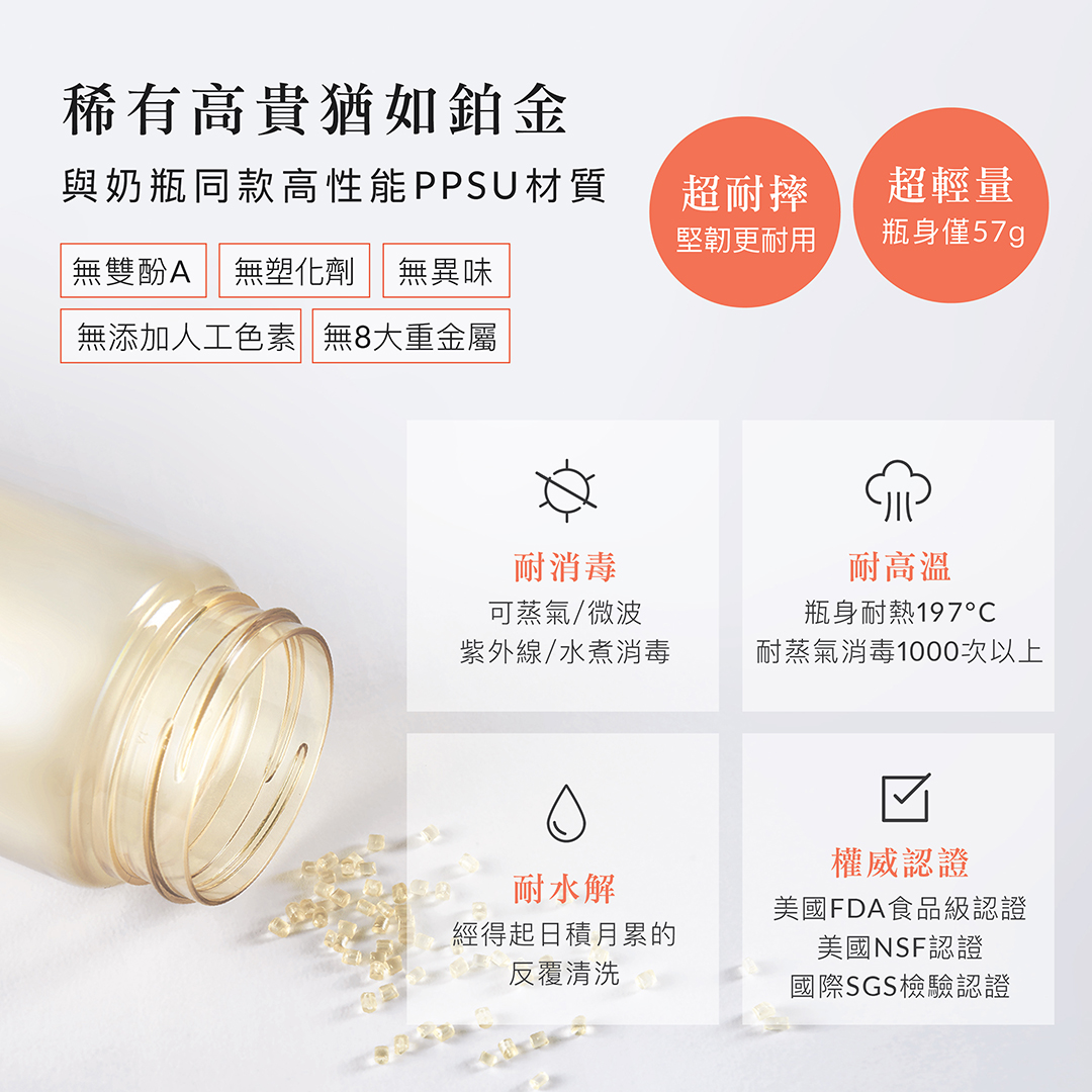 ●與奶瓶同款高性能PPSU材質,無雙酚A、塑化劑、無8大重金屬。