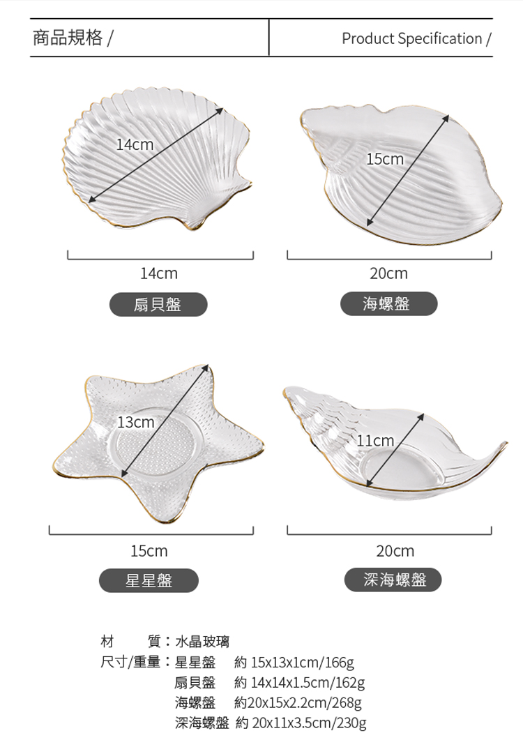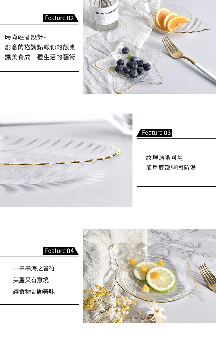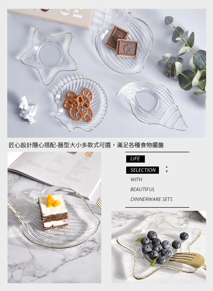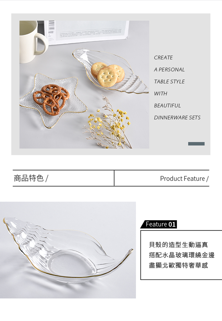 ★一日三餐美器相伴■貝殼的造型生動逼真搭配水晶玻璃環繞金邊盡顯北歐獨特奢華感■時尚輕奢設計-創意的格調點綴你的飯桌,讓美食成一種生活的藝術■一串串海之音符,美麗又有意境,讓食物更顯美味■紋理清晰可見,加厚底部堅固防滑■匠心設計隨心搭配-器型大小多款式可選,滿足各種食物擺盤