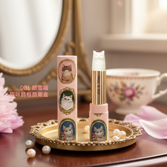 派對貓咪珍珠光限量護唇膏 001 銀雪喵 + 貓咪飾框唇膏盒