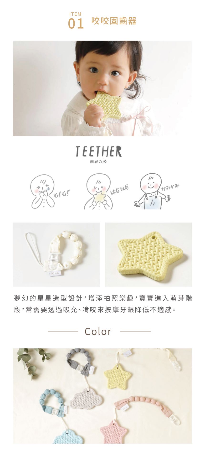 ●雲朵咬咬固齒器/星星咬咬固齒器材質:矽橡膠(固齒器)、表布100%棉(防掉夾)、100%聚苯乙烯(填充物)、60%亞麻 40%棉(固定繩)、聚碳酸酯(夾子)尺寸:雲朵款固齒器 約9.9×6.4cm、星星款固齒器 約8×8cm、防掉夾約23㎝(縄子部分8㎝)適月年齡:3~12個月產地:日本※洗滌說明:150℃的耐熱性,可以放置洗碗機清洗