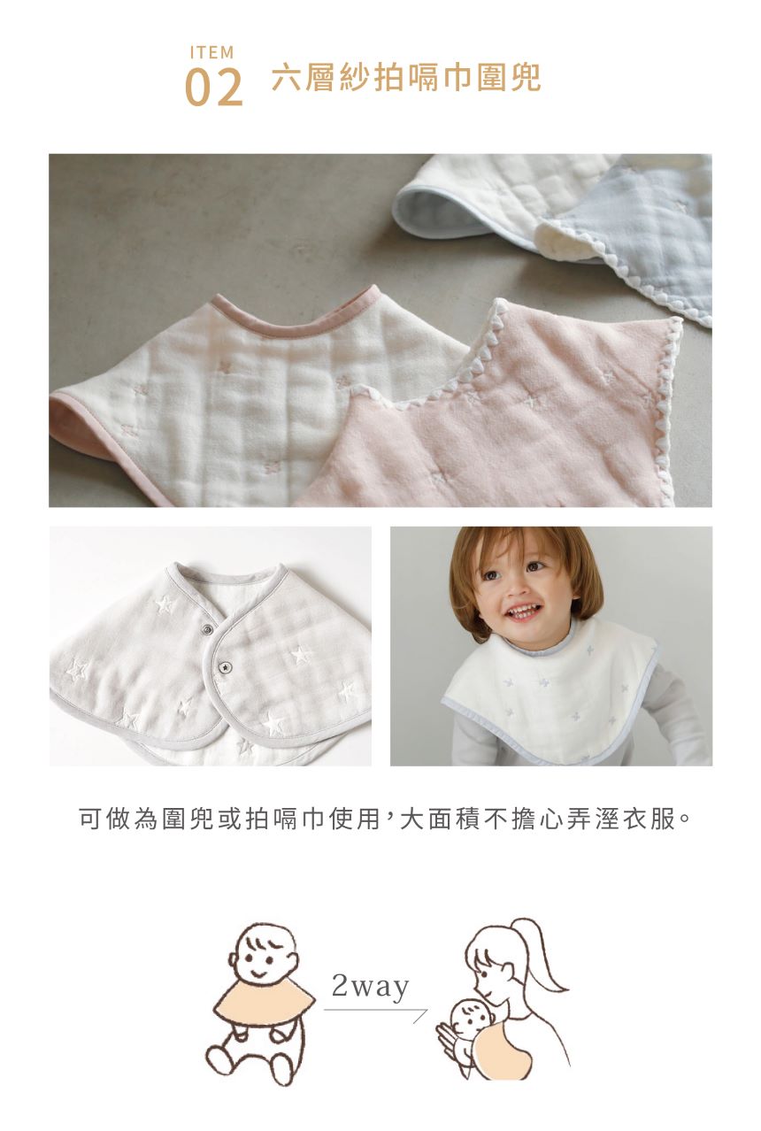 ●六層紗拍嗝巾圍兜顏色:銀河星彩/十字星彩粉紅/十字星彩粉藍材質:100%棉尺寸:約44×33cm / 長:約21cm / 脖圍:約28cm、31cm(2段階調節)產地:日本
