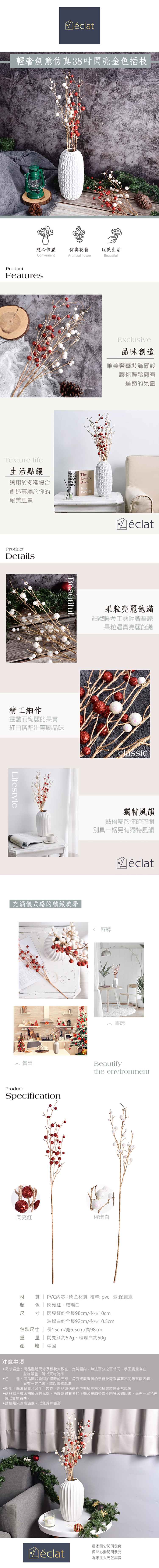 規格材質:PVC內芯+閃金材質 枝幹: pvc 球:保麗龍顏色:閃亮紅、璀璨白尺寸:閃亮紅約全長98cm/樹枝10cm 璀璨白約全長92cm/樹枝10.5cm包裝尺寸:長15cm/寬6.5cm/高98cm重量:閃亮紅約52g 璀璨白約50g