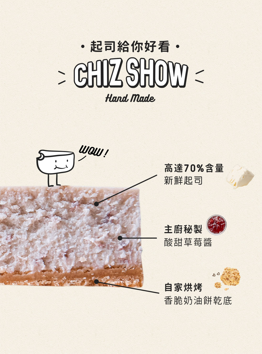 成份:奶油乳酪、自製奶油酥餅(原味:低筋麵粉、無鹽奶油、糖粉)、雞蛋、砂糖、草莓醬