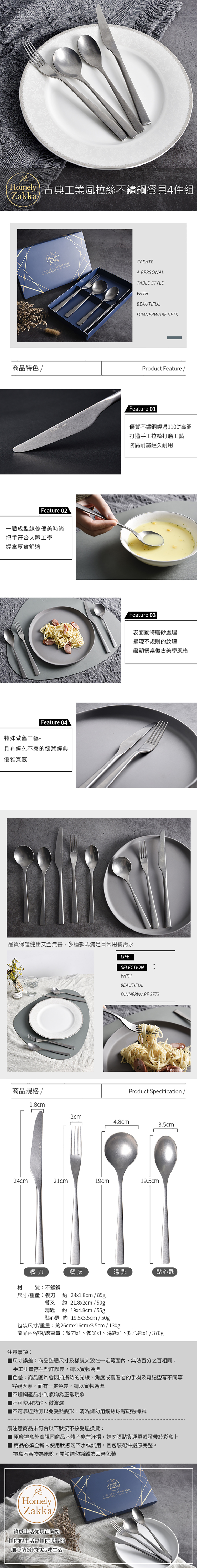 規格■材質:不鏽鋼■尺寸/重量: 餐刀 約 24x1.8cm/85g 餐叉 約 21.8x2cm/50g 湯匙 約 19x4.8cm/55g 點心匙 約 19.5x3.5cm/50g■包裝尺寸/重量: 約26cmX16cmX3.5cm/130g■商品內容物/總重量: 餐刀X1、餐叉X1、湯匙X1、點心匙X1/370g■產地:中國
