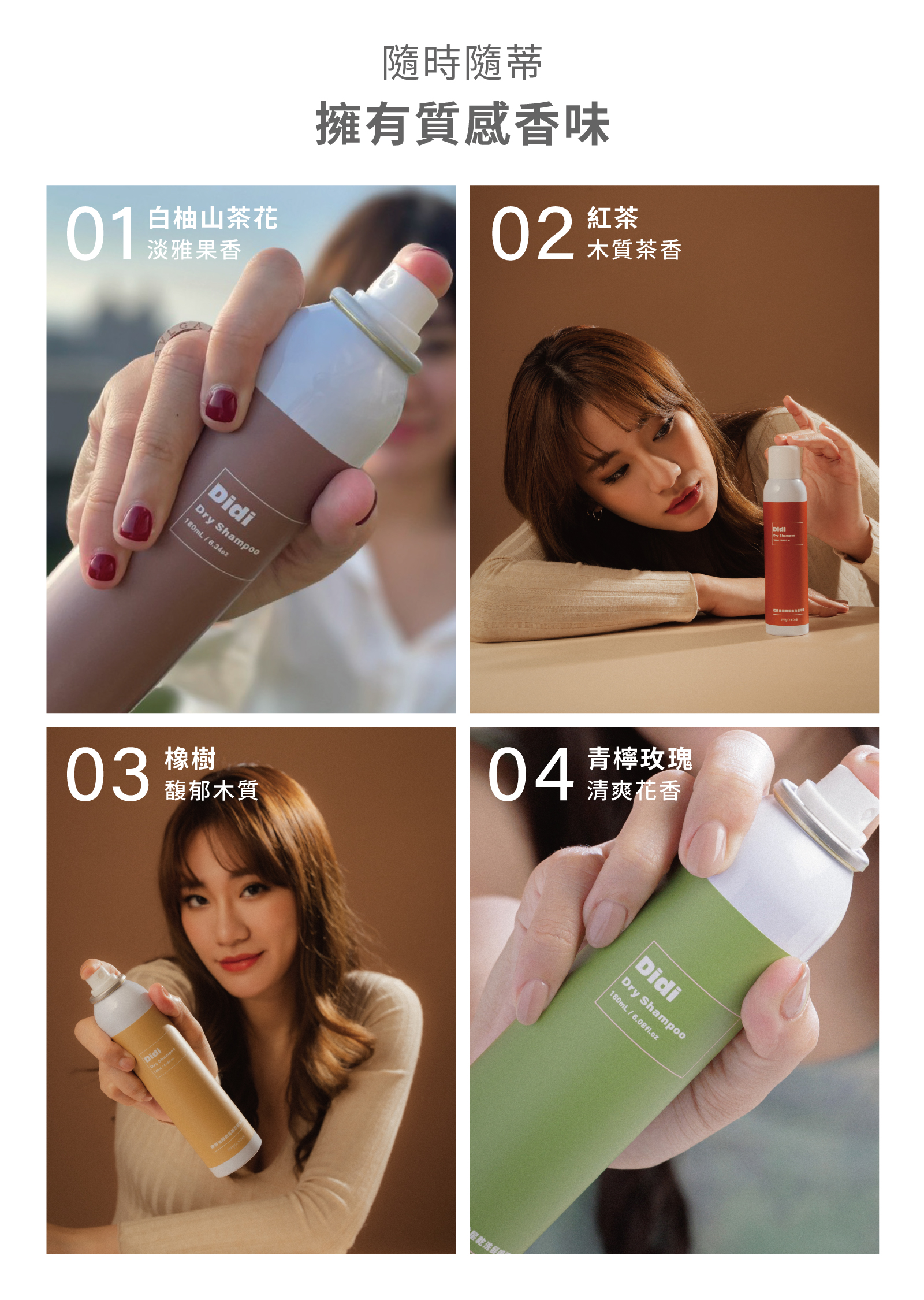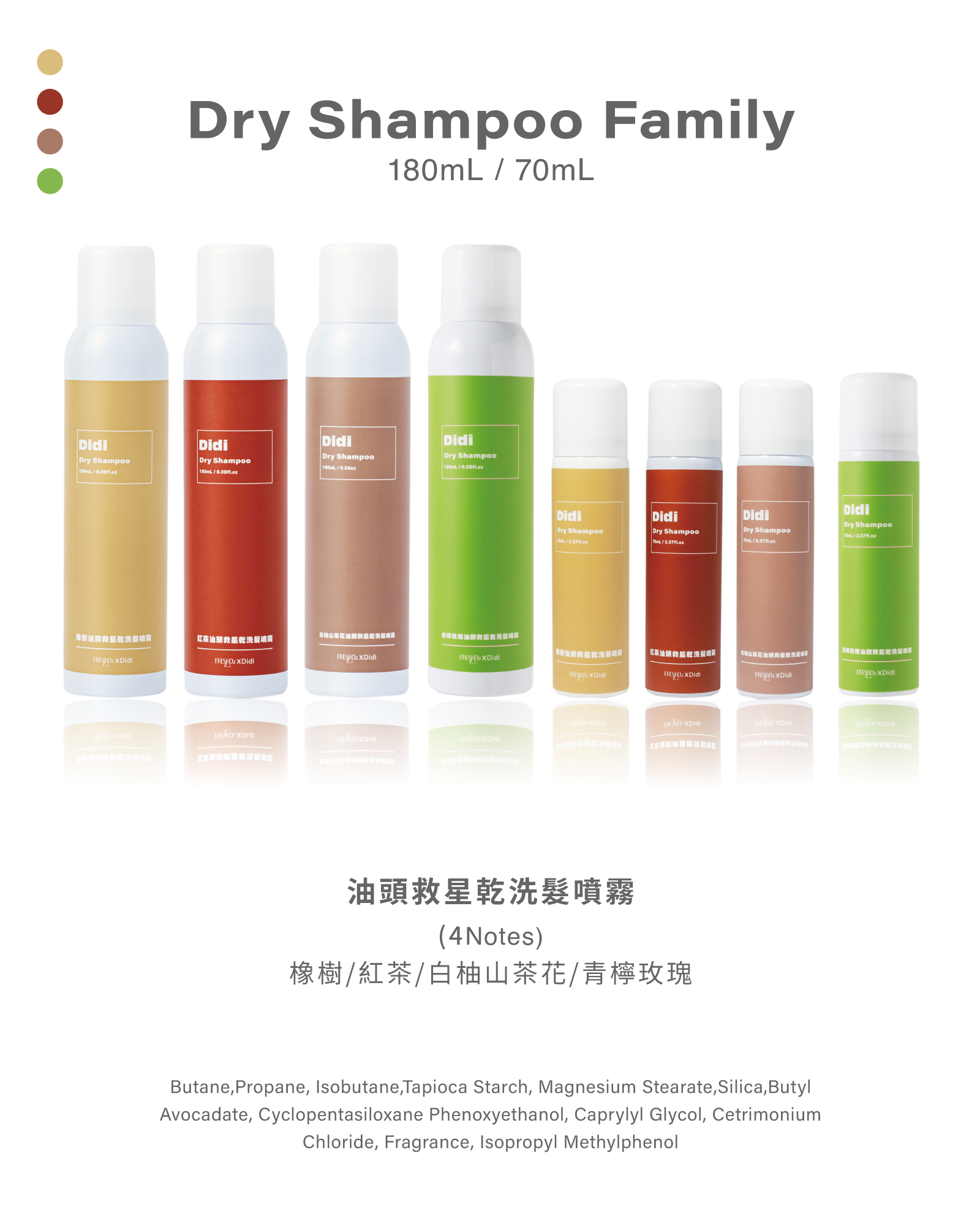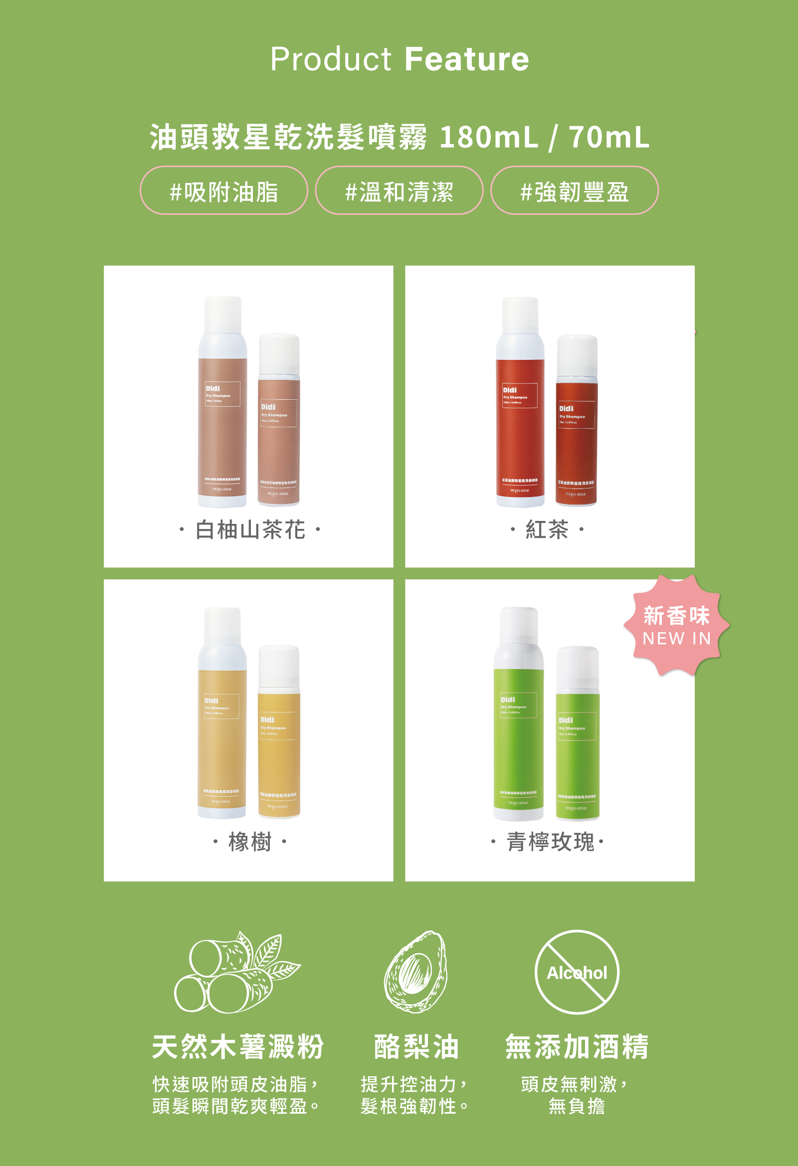 DIDI 油頭救星乾洗髮噴霧 180mL - 白柚山茶 / 紅茶 / 橡樹 / NEW青檸玫瑰超強吸油力的極細緻木薯澱粉,快速吸附頭皮油脂,保持頭髮乾爽輕盈,同時添加酪梨油成分,去油蓬鬆並增加髮根強韌力,同時結合了清新茶香,快速趕走惱人髮根氣味,隨時擁有迷人蓬鬆秀髮。