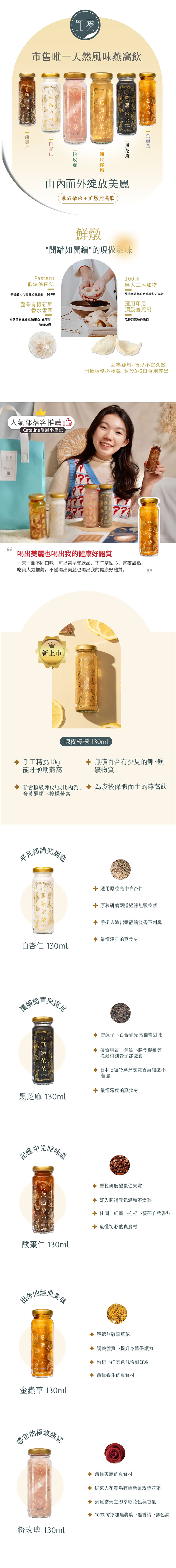 燕遇朵朵不是傳統罐頭燕窩或是糖水燕窩,每一罐(130ml)講究到底,食材都是一時之選:粉玫瑰-有機鮮花瓣抗自由基金蟲草-無硫蟲草花護心提氣白杏仁-原粒研磨暖心頭酸棗仁-寧心安神助好眠黑芝麻-從髮梢到骨子都滋養陳皮檸檬-新會陳皮養氣保體
