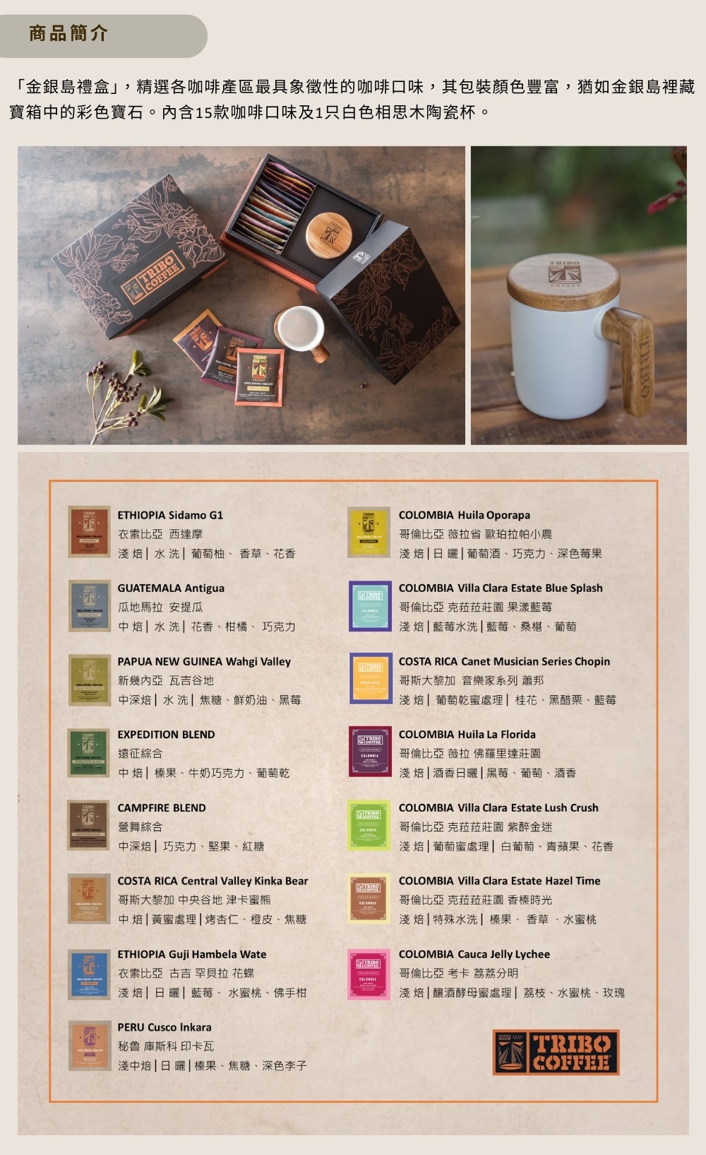 品 名: TRIBO COFFEE 金銀島濾掛式咖啡禮盒 相思木陶瓷杯 (白 / 15入)