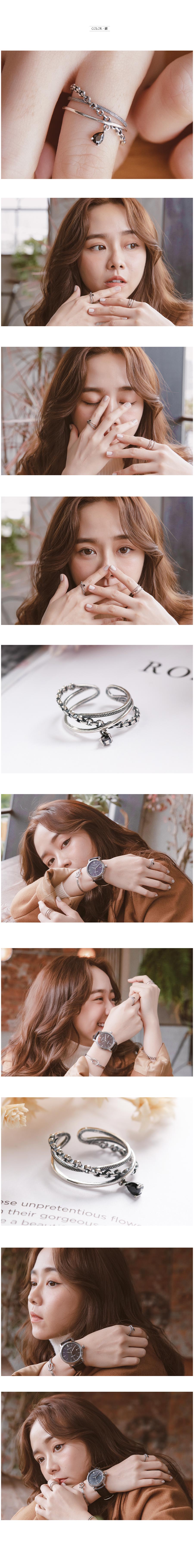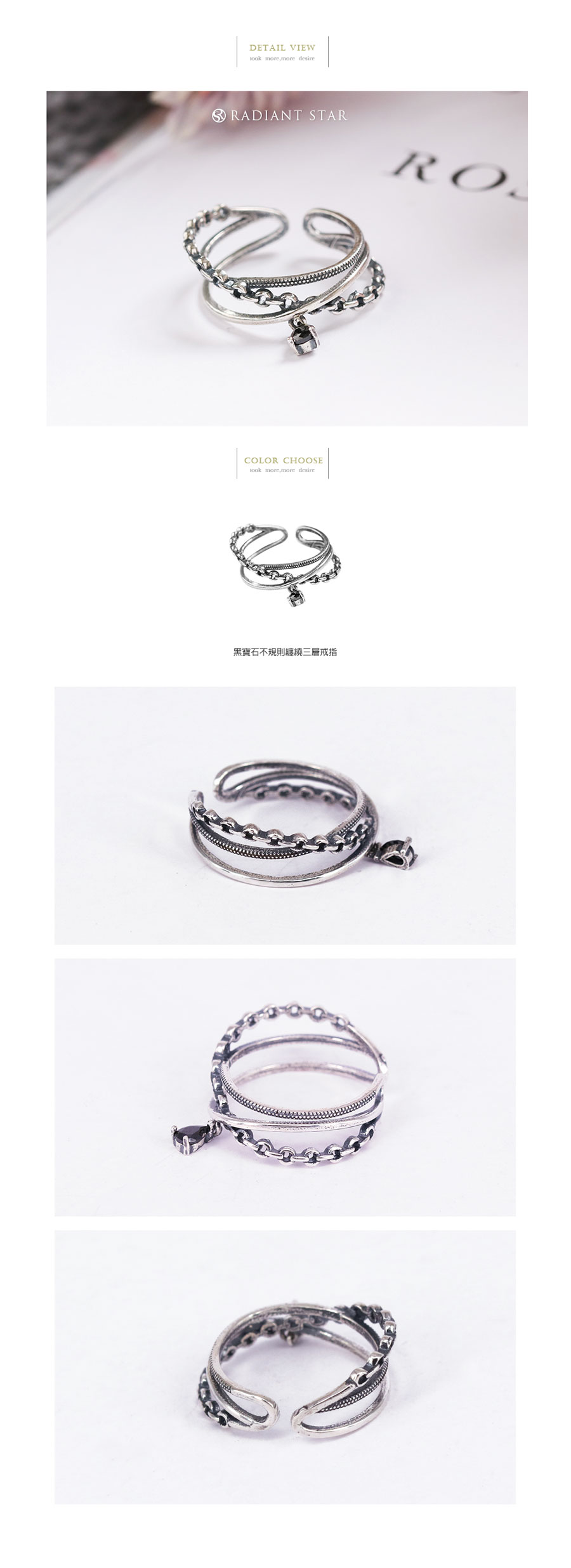 鐵鍊與繩的不規則設計形成三層簍空戒指黑寶石增添神秘感指圍可調式更方便喔!