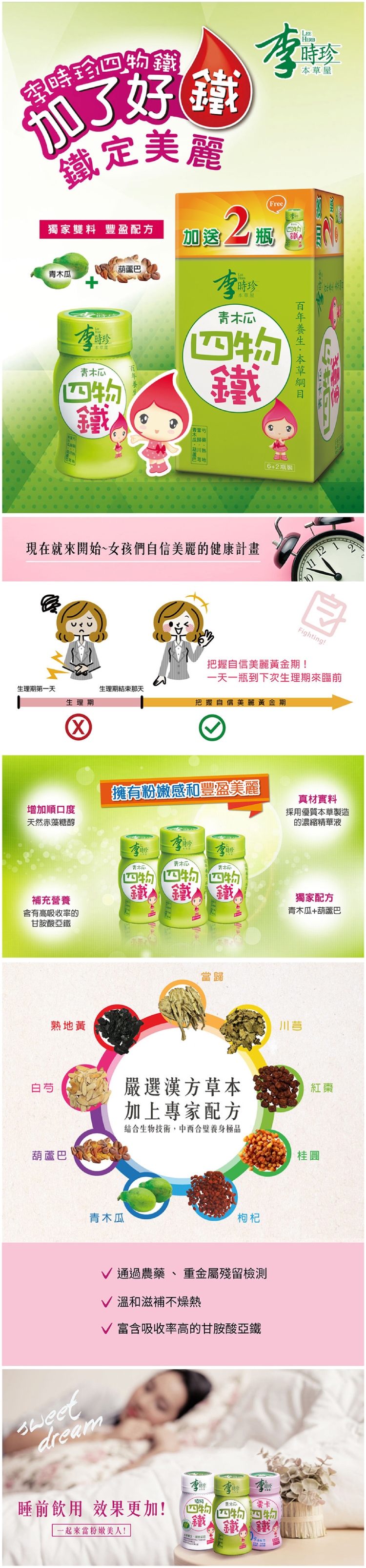 本品獨特的雙料豐盈配方-青木瓜+葫蘆巴,讓女孩更有料,自然而然散發迷人丰采!嚴選漢方本草,萃取頂級四物精華,並富含聯合國指名推薦的世界專利好鐵「甘胺酸亞鐵」,吸收率高,更容易被人體吸收!清甜的桂圓口味,好喝更健康,每瓶僅23.2大卡,讓女孩們輕鬆健康沒煩惱。