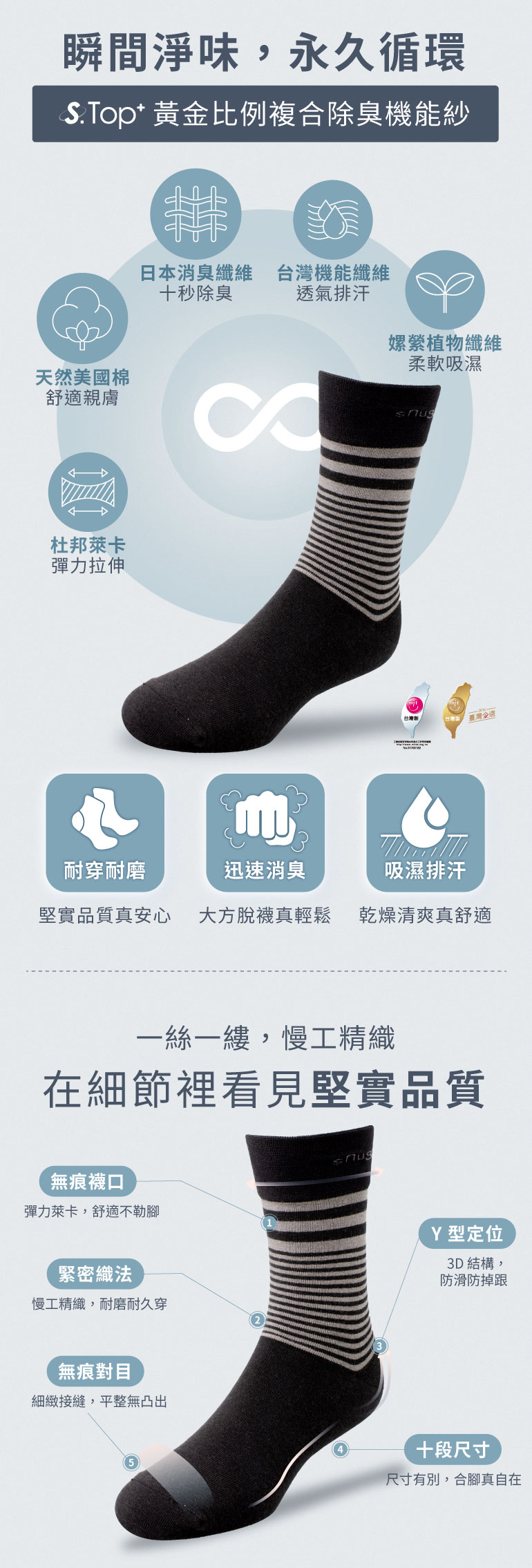 襪子成分:棉(S-Top+消臭棉)80% 、彈性纖維20%