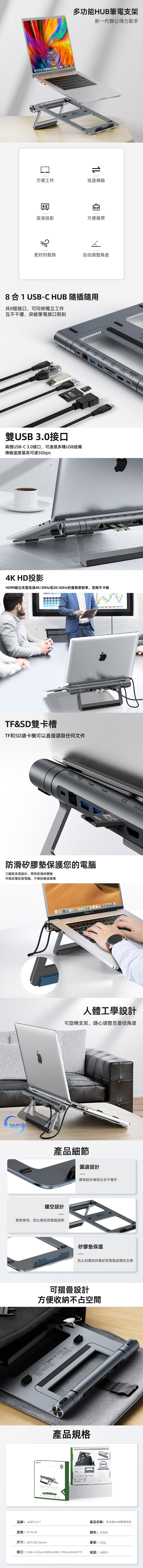 產品規格:• 型號:E5 PLUS• 顏色:太空灰• 材質:鋁合金+PC+ABC+矽膠• 接口:USB-A 3.0x2+HDMI+USB-C PD+LAN+SD/TF• 含包裝尺寸:310x280x38 mm• 含包裝重量:740g• BSMI認證:D65076• 產地:中國• 保固:2年