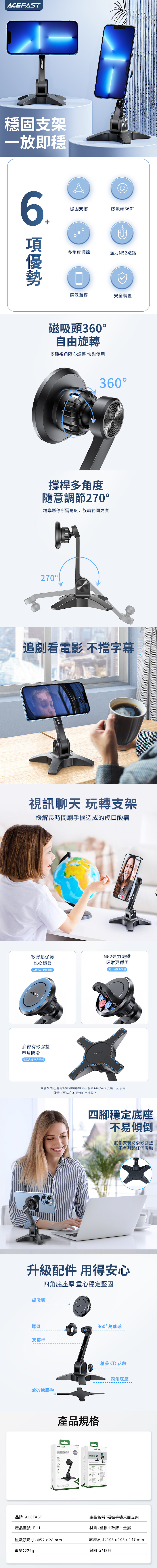 產品規格:• 型號:E11• 材質:塑膠+矽膠+金屬• 適合安裝地點:桌面• 底座尺寸:103x103x147 mm• 含包裝尺寸:188x108x58 mm• 含包裝重量:328g• 產地:中國• 保固:2年
