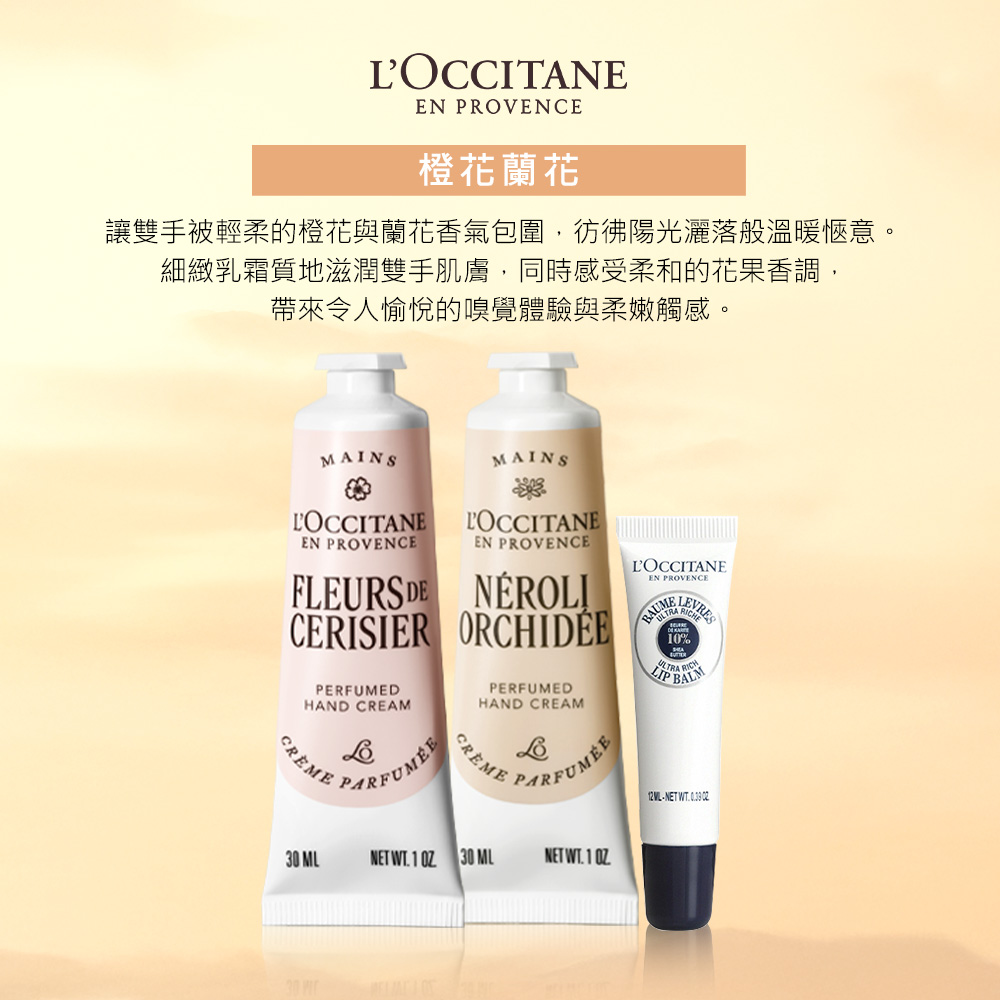 • 橙花蘭花護手霜30ml,數量:1• 乳油木保濕護唇膏12ml,數量:1• 櫻花護手霜30ml ,數量:1