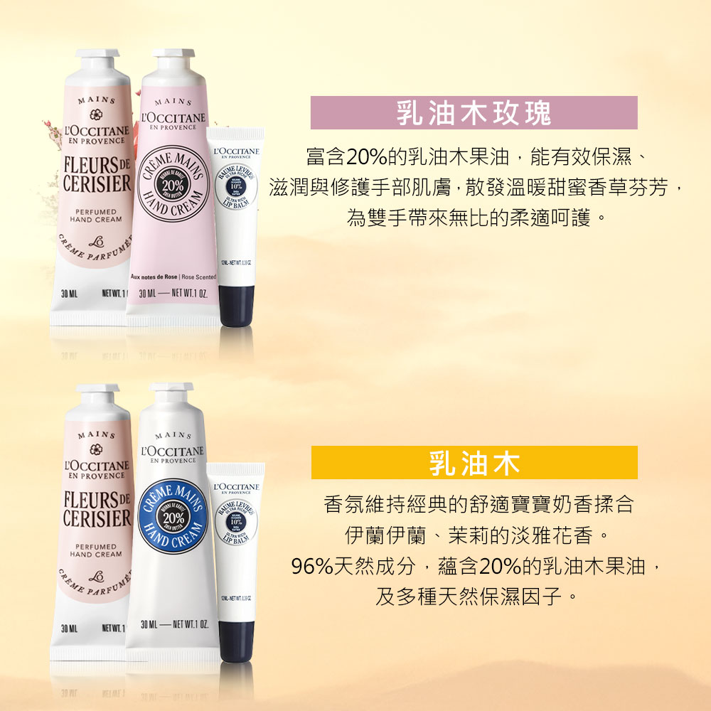 • 乳油木玫瑰護手霜30ml,數量:1 • 櫻花護手霜30ml,數量:1• 乳油木保濕護唇膏12ml,數量:1