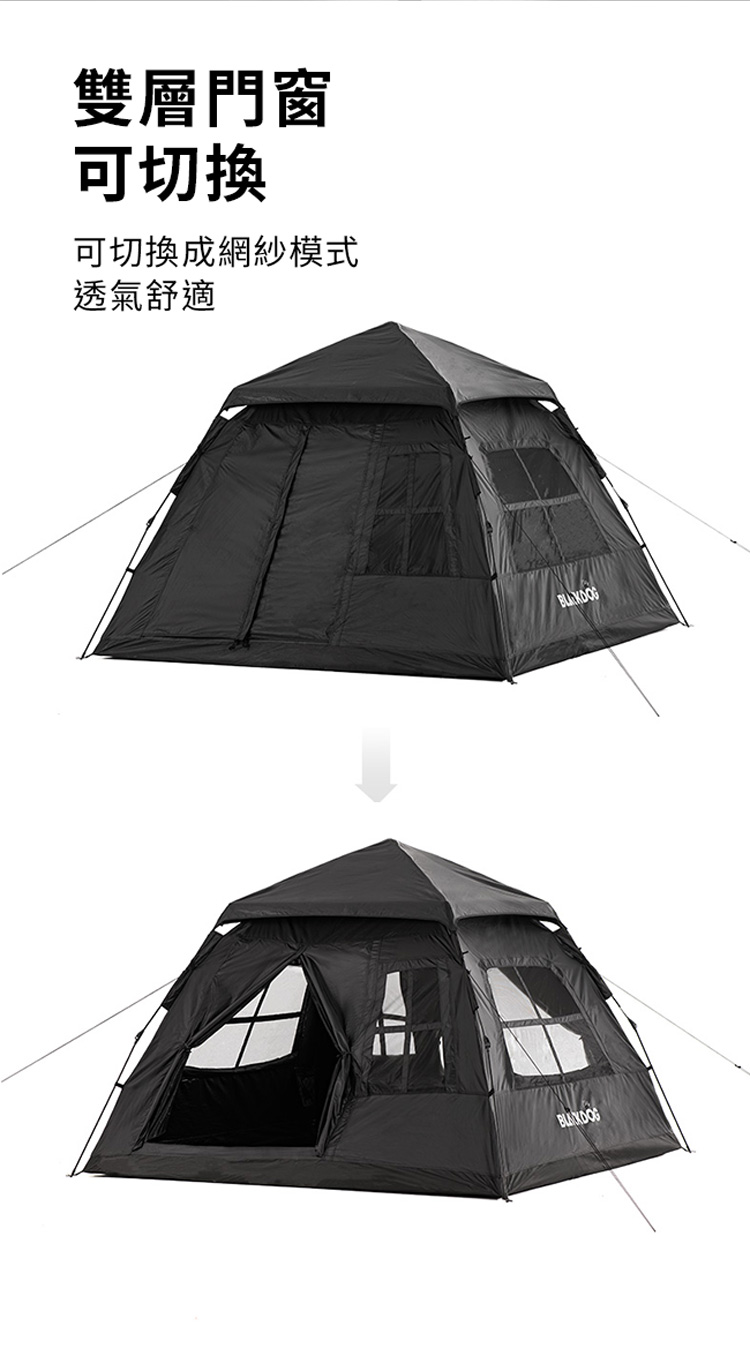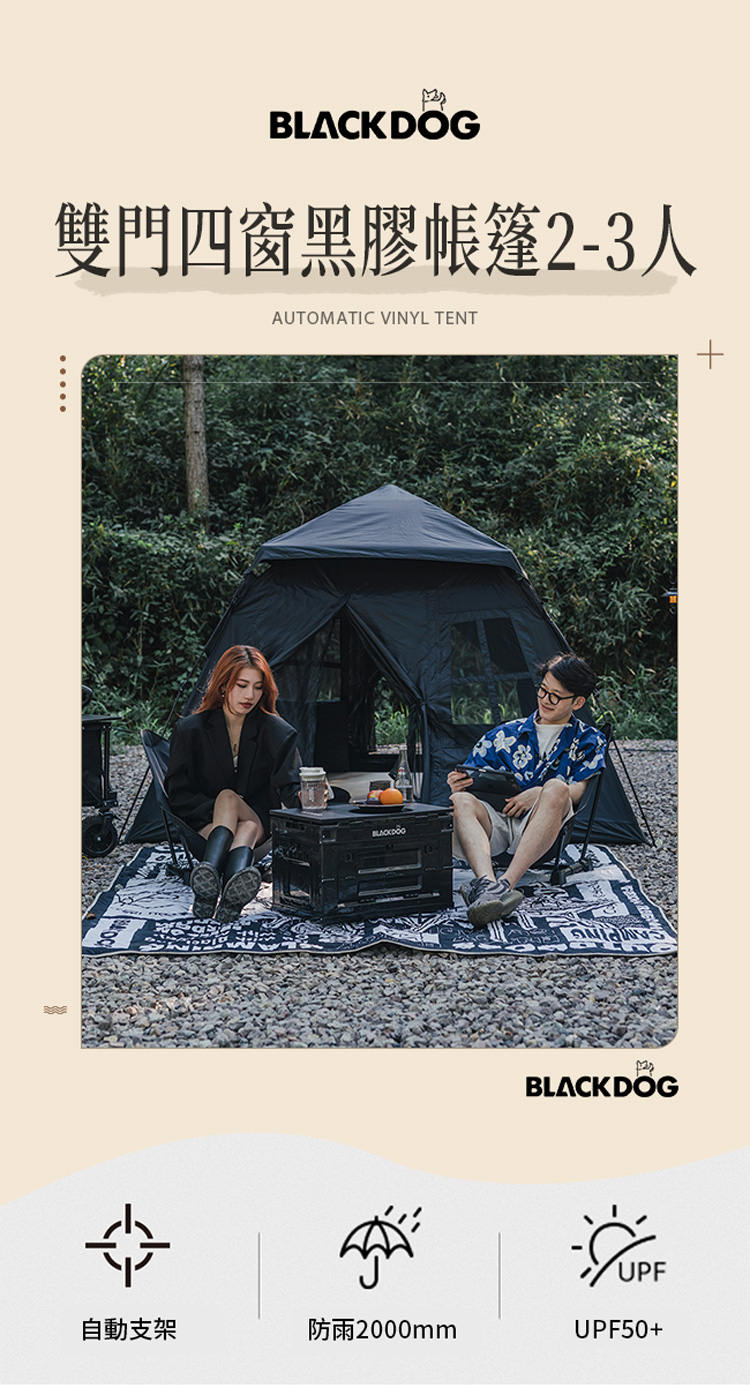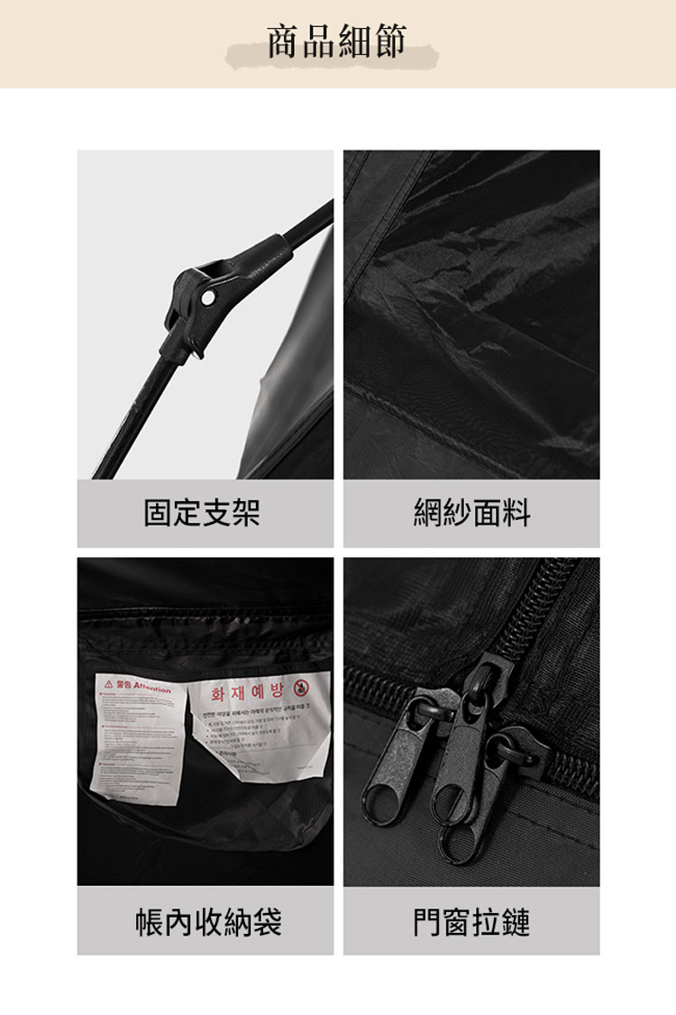 ◆加強彈簧撐桿,收搭方便◆黑膠塗層UPF50+,有效阻擋紫外線◆雙門四窗+網紗設計,通風不悶熱◆伸縮式玻纖帳桿,牢固穩定更耐用