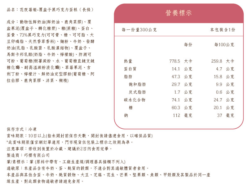 商品內容名稱:花夜莓姬-覆盆子黑巧克力蛋糕貨號:010100281材質:食品尺寸:長條約17×6×5公分
