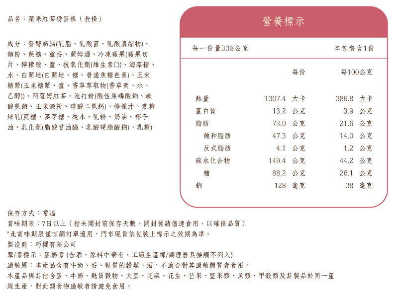 商品內容名稱:蘋果紅茶磅蛋糕貨號:010100451材質:食品尺寸:約 17×6.5×4.5公分
