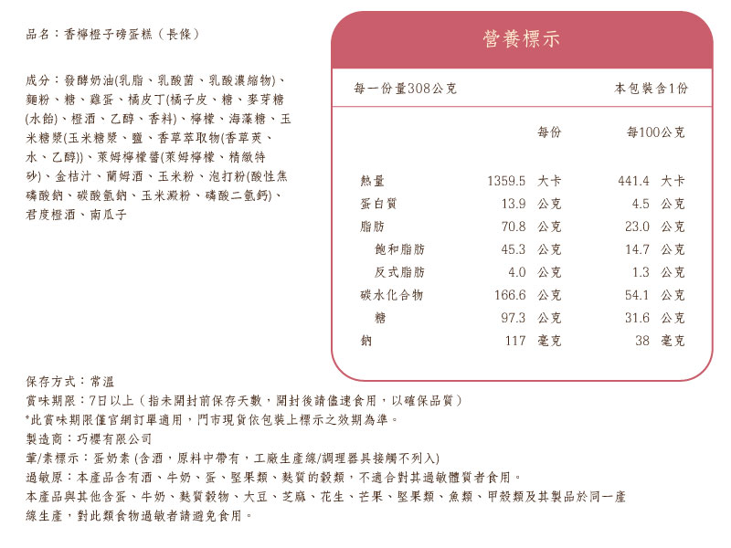 商品內容名稱:香檸橙子磅蛋糕貨號:010100211材質:食品尺寸:約 17*6.5*4.5公分
