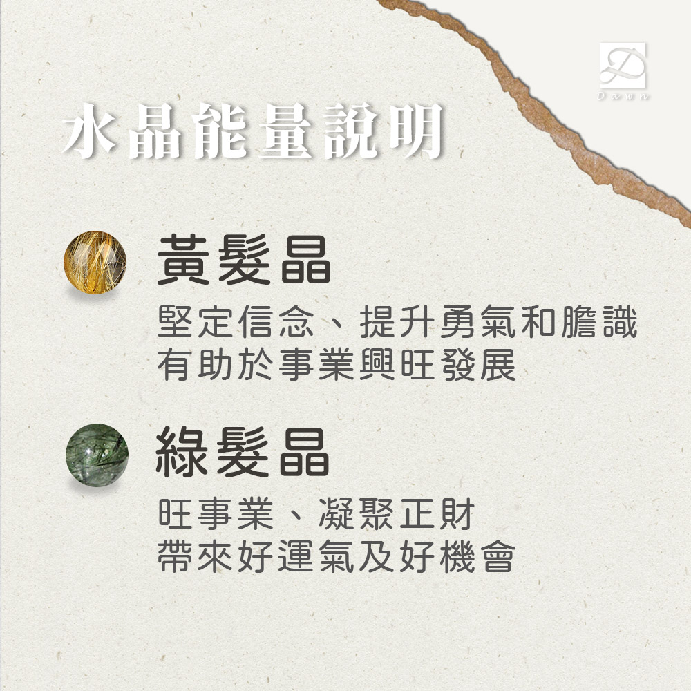 別人眼中的你,像個工作狂,相當注意規則的細節,渾身散發著高級質感的魅力。我眼中的你,是永不過期的少年,既有靈性的深度,也擁有成功的高度。黃髮晶擁有強烈能量,有助於突破自我限制,擁有領袖石的特質。綠髮晶象徵財富,能幫助內在整合,發揮自我潛能。以金色小珠串連黃髮晶及綠髮晶,搭配閃亮月亮飾品,增添個人優質自信魅力。