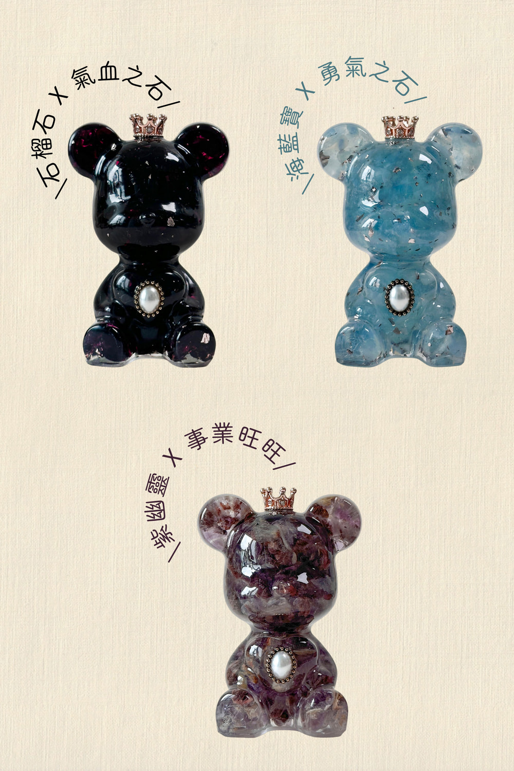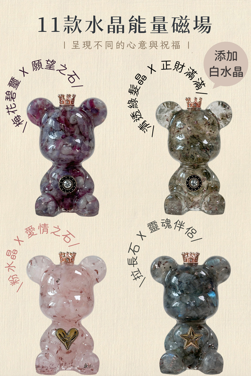 我們將天然原礦碎石,封存於純淨的小熊姿態中。每一尊小熊都頭戴尊榮皇冠、懷抱閃耀愛心,承載著不同的心意與祝福。從招財的綠髮晶、療癒的月光石,到提升魅力的櫻花瑪瑙,為您的日常補給能量。