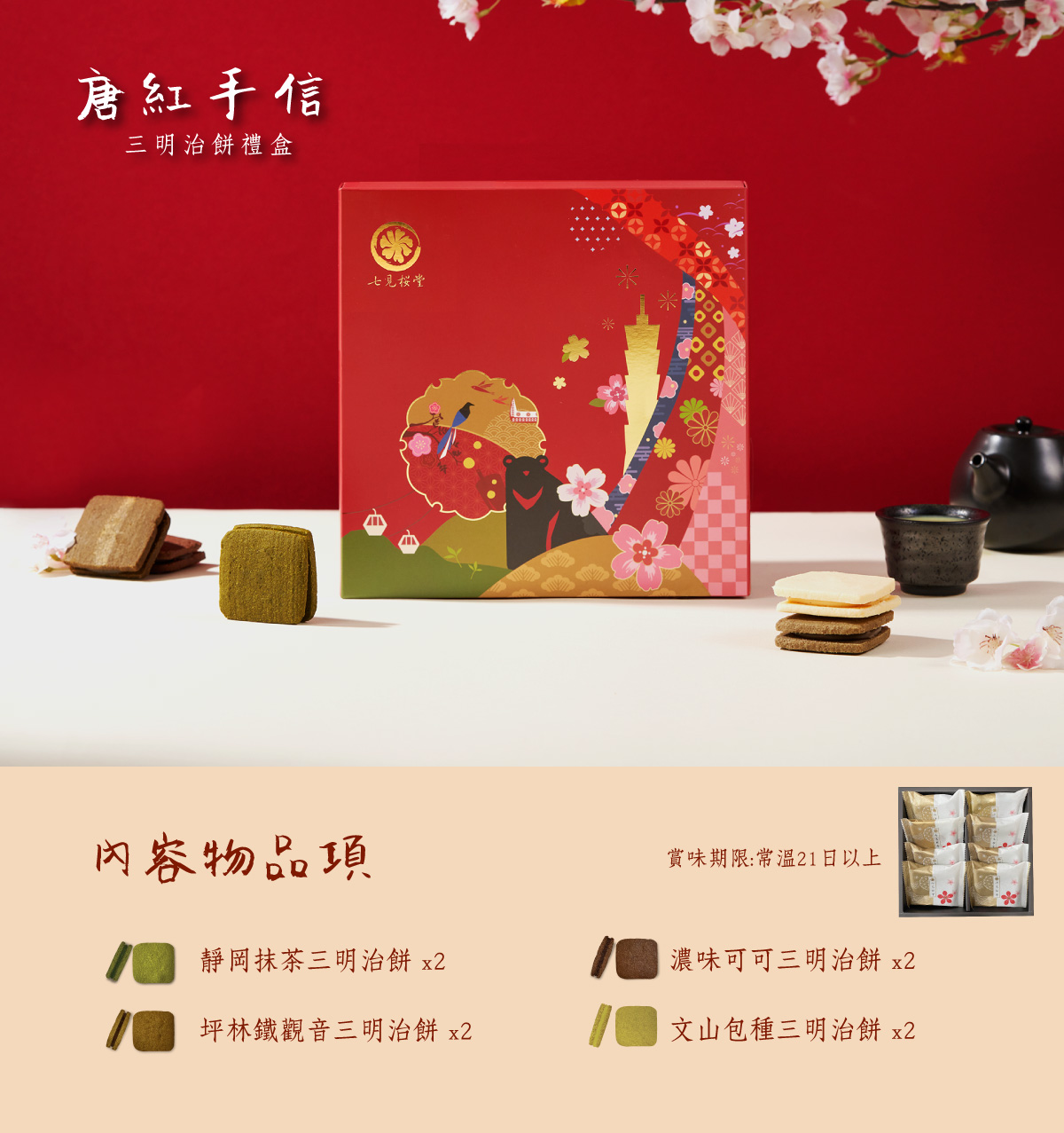 商品內容名稱:唐紅手信-三明治餅禮盒(8入)貨號:011500861材質:食品尺寸:約21.5*21.5*5.5公分