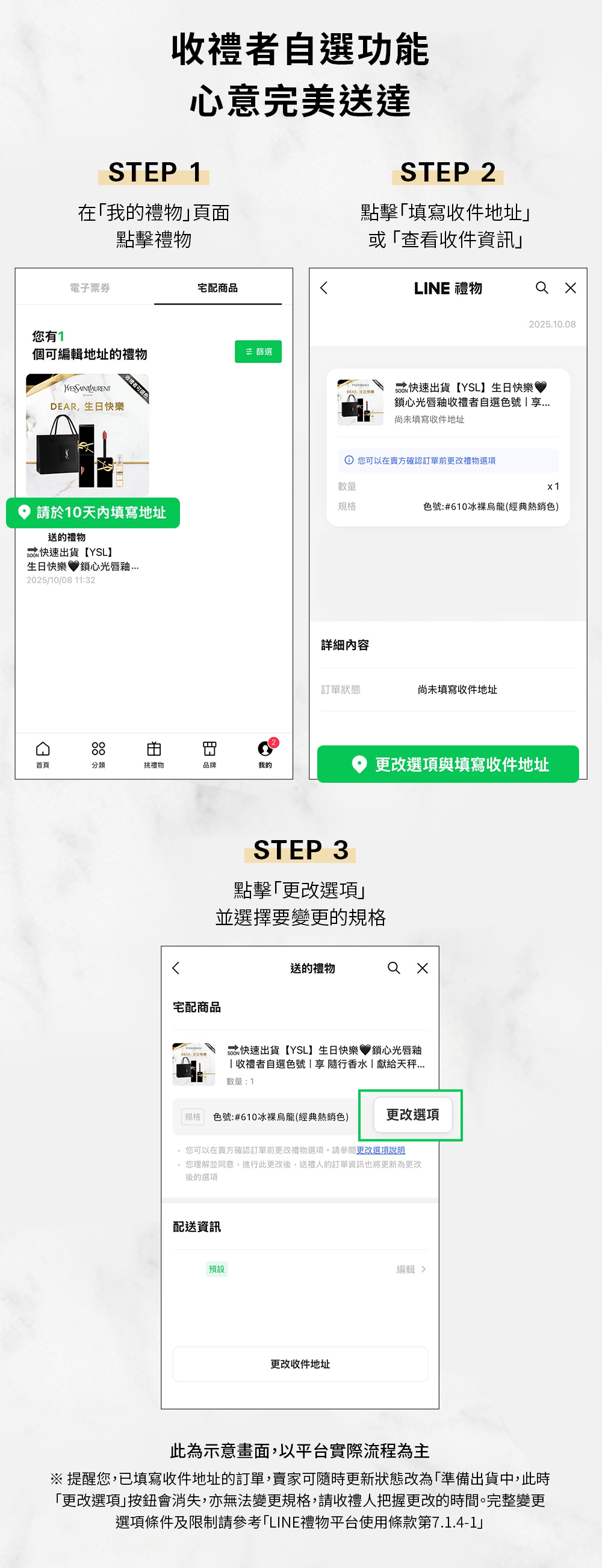 【快速出貨說明】完成付款及寄送地址確認後,於1個工作日內(不含週休及國定例假日)出貨,實際配送時間依物流公司時間為主。收到商品有破損等其他問題,請協助拍照,與我們連絡,我們會立即為您處理。 【快速出貨條件與辦法】1.週一至週五00:00~13:00付款成功訂單(國定假日除外)且完成收件地址填寫2.以下不符快速出貨服務範圍: 週一至週五 13:01~23:59付款成功且完成地址填寫 週六至週日 00:00~23:59付款成功且完成地址填寫 預購商品、刻字的客製化訂單 收件資料不全、變更配送地址、收件人資料有誤或無法收貨 【注意事項】送禮訂單,若在成立訂單時未填寫收禮者地址, 收禮者可以至[我的/我的禮物/點擊商品/填寫地址] ,若在成立訂單後10天內未填寫地址, 訂單將自動取消,退款予送禮者,惟客自商品因客製化緣故,不予以退換貨。 【退換貨說明】本商品無法提供換貨服務,如需其他商品請您重新購買,促銷活動和商品庫存依當時頁面為主。如欲退貨,可於7天猶豫期,於LINE禮物/我的/我的禮物/點擊商品/[洽詢訂單問題] ,提出需求給我們,我們收到後,儘快派宅配至您指定地點收取,收回商品確認無異狀,退款給送禮者。退貨時,您所退回的商品內容必須維持所有商品、贈品、附件、包裝、附隨文件或資料的完整性,若未使用原始包裝寄回,商品有缺件或毀損,我們有權拒絕您的退貨申請。本產品屬於私人消耗性產品,已拆封或使用過、無法恢復原狀、商品外盒損壞等均恕無法辦理退貨。為保障您的權益, 若您所訂購商品本身有瑕庛問題,可於7天猶豫期內,免費申請退換商品,並限換同一件商品。 【商家資訊】公司名稱:台灣萊雅股份有限公司公司地址:台北市信義區信義路5段7號22樓統一編號:23991432客服專線:0800-818-600客服時段:周一至周五 9:30-18:30(國定假日除外)