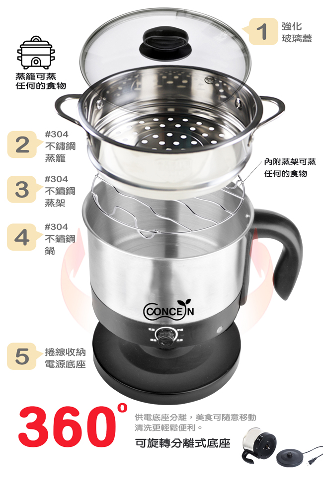 .1.6L大容量.附贈不鏽鋼蒸架.食用級304不鏽鋼.可分離式底座,清洗更便利