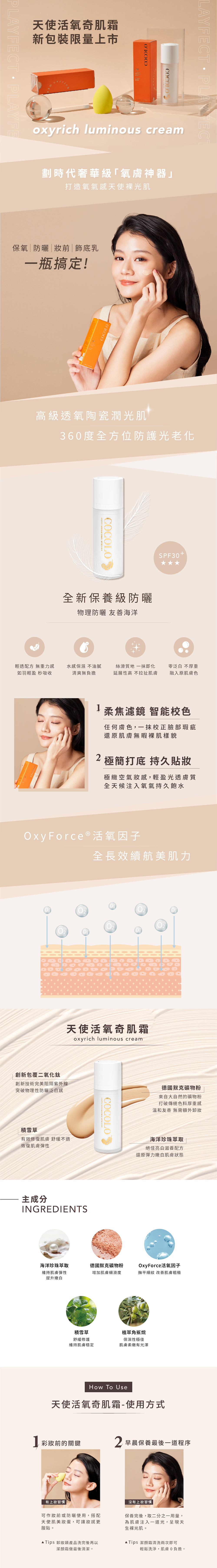 💫 1瓶7效!5秒打造奶油霧透肌💫 保濕 / 抗老 / 亮白 / 防曬 / 潤色 / 妝前 / 隔離 一瓶搞定!💫 SPF30★★★ ,阻隔UVA/UVB,防曬黑/防曬老💫 純物理性防曬,不含化學防曬劑,友善海洋💫 德國默克天然礦物粉,輕透抗悶不長痘,水透不黏膩💫 OxyForce活氧因子,揮別暗沈蠟黃,精準校色肌膚色澤💫 無需卸妝,可使用童顏肌淨潔顏霜清潔兩次即可
