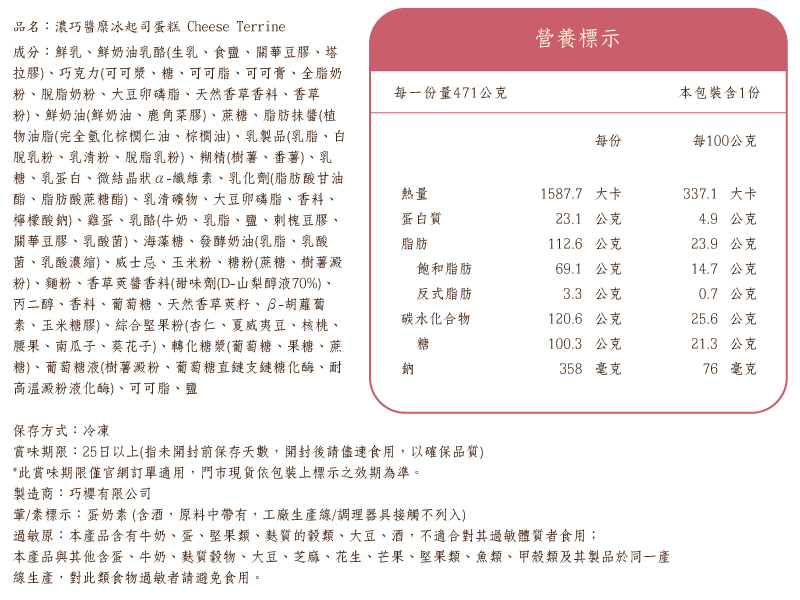 商品內容名稱:濃巧醬糜冰起司蛋糕 Cheese Terrine貨號:010100831材質:食品尺寸:約 17*6.5*4.5公分