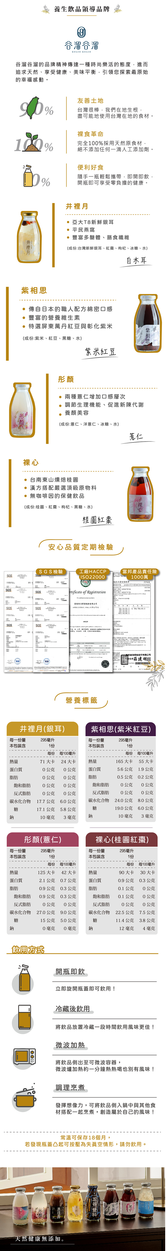 商品成分:井裡月:亞大T8新鮮銀耳、枸杞、紅棗、冰糖、水 紫相思:嚴選屏東萬丹紅豆、彰化紫米、黑糖、冰糖、水 彤顏:薏仁、洋薏仁、冰糖、水 裸心:台南東山燻焙桂圓、紅棗、枸杞、黑糖、冰糖、水 包裝規格:單瓶295mlx8瓶(含禮盒),各口味2瓶商品保證:不添加防腐劑、化學添加劑、色素、香料,天然健康無添加飲用方式:■ 開瓶即飲■ 冷藏後飲用■ 倒出以微波加熱一分鐘■ 調理烹煮
