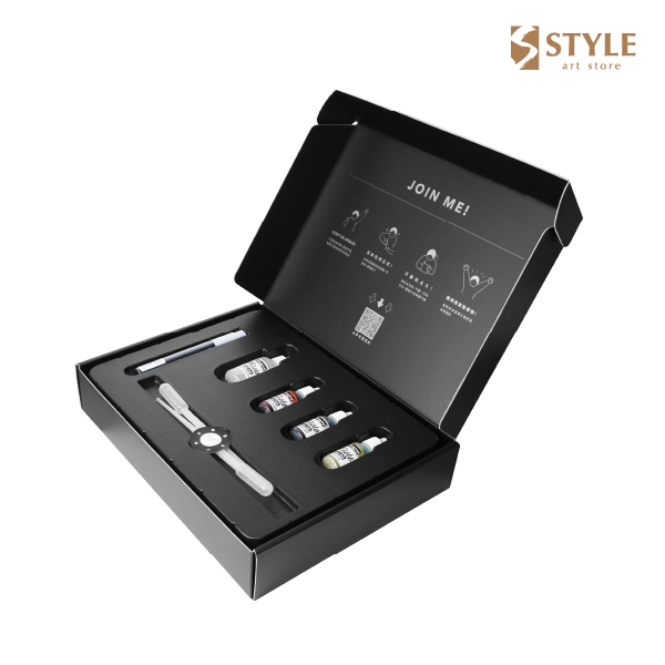 酒精墨水藝術材料包打開包裝即可使用,掃描 QR code 即能看到教學影片,無論是有經驗者或是初學者都能以最便利的方式上手,精緻的禮盒包裝增添儀式感。