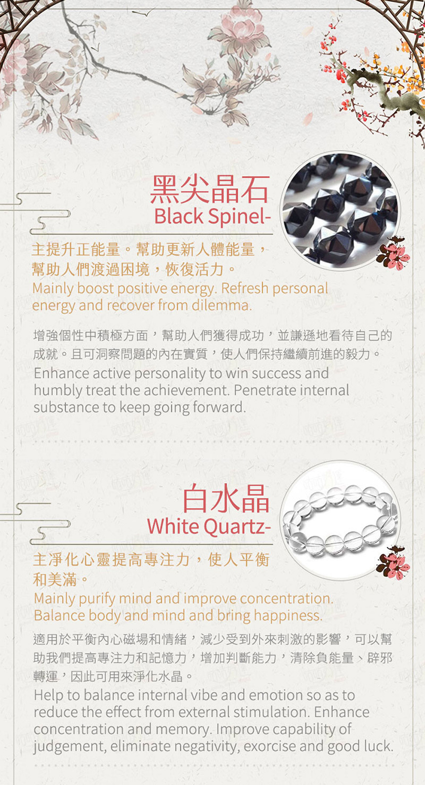 源源不絕的動力,是一生中最重要的事。黑色尖晶石具有保護、穩固能量,令人變得更有毅力。白水晶能令心靈歸零,得到安定。
