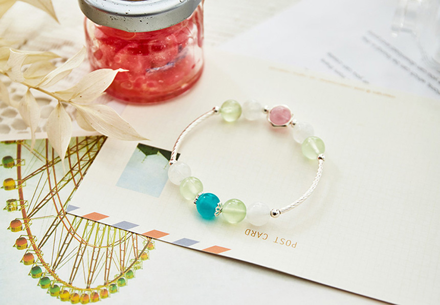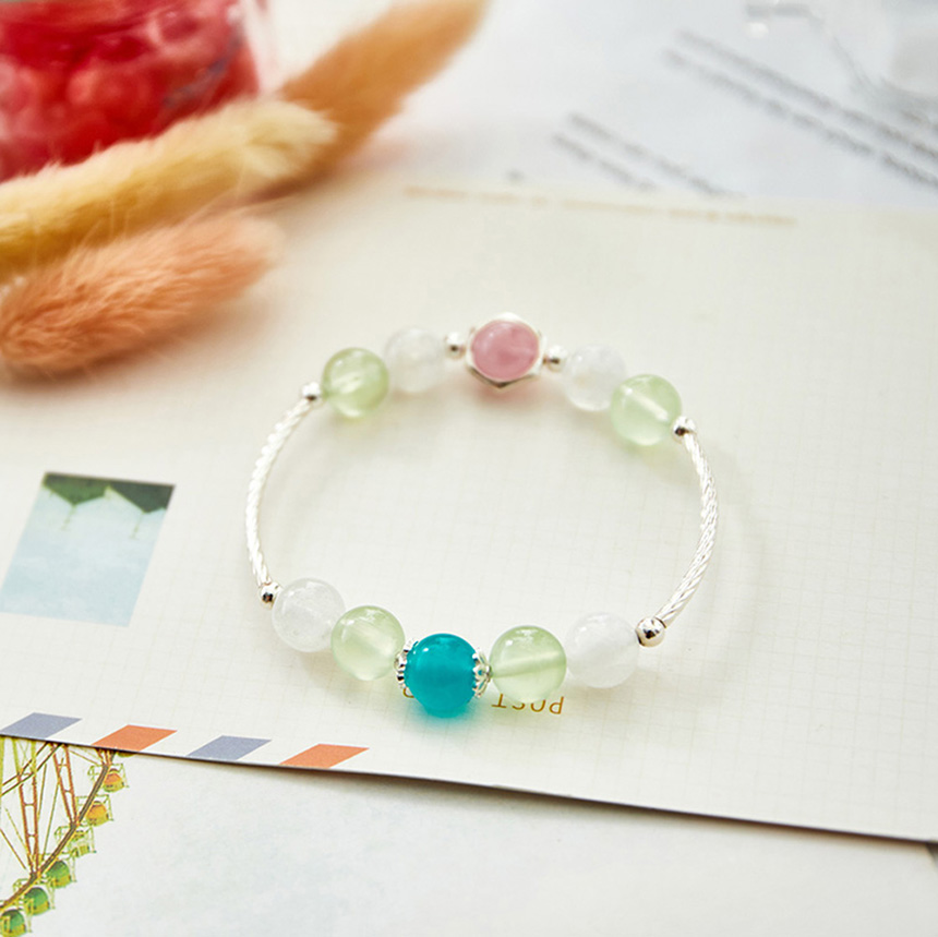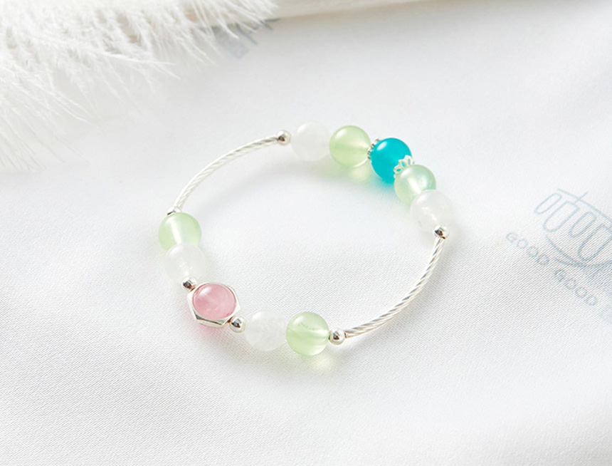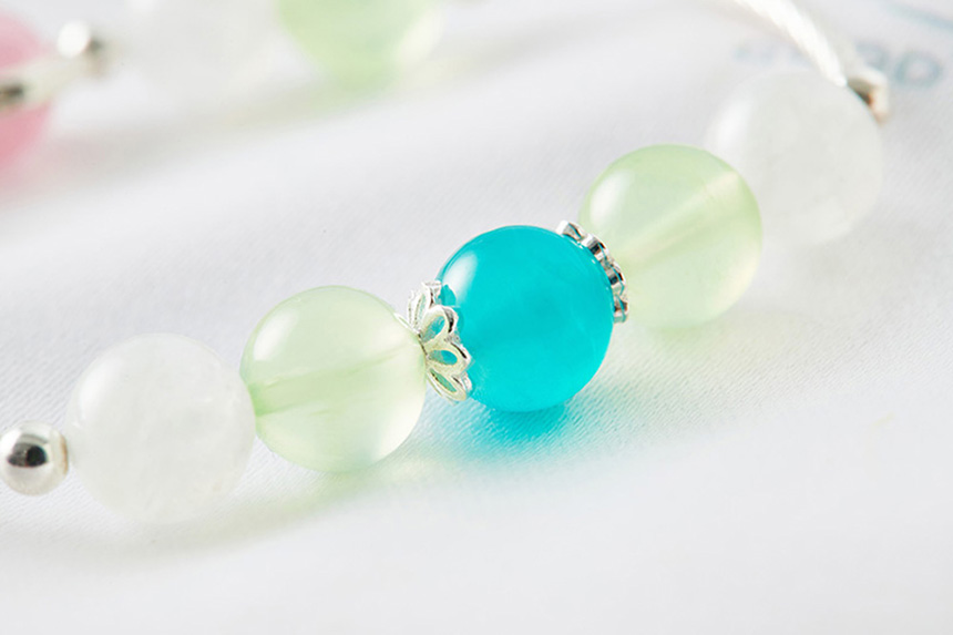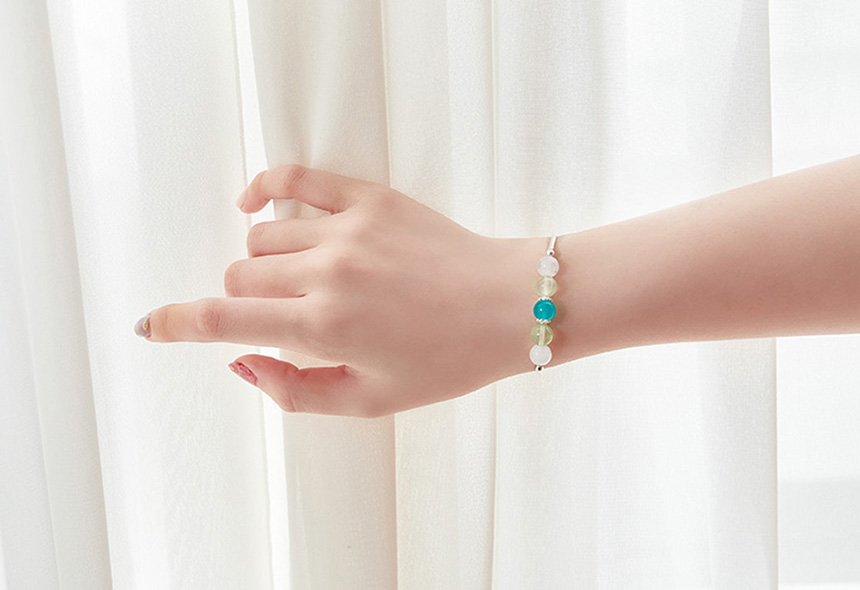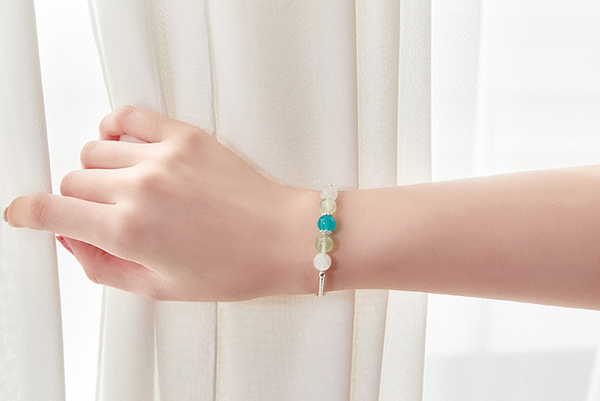 誰說賺錢顧不得愛情呢?由單顆平衡感性的天河石,攜領八顆嚴選月光石、葡萄石,象徵穩健成長的事業,