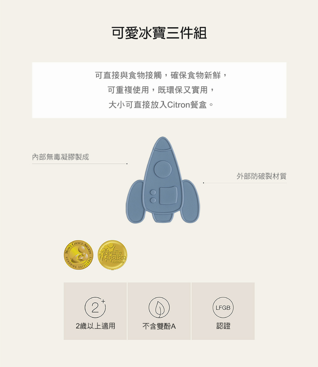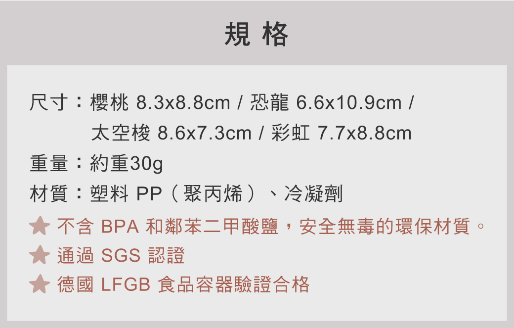 ✔通過SGS 認證德國LFGB食品容器驗證合格✔內部無毒凝膠、外部由抗斷裂材料製成✔可愛造型,大小可直接放入Citron餐盒✔可直接與食物接觸✔不含 BPA 和鄰苯二甲酸鹽的材料可確保您的安全和環境✔ 可重覆使用環保實用✔如冰保外殼破裂,請更換及停止使用