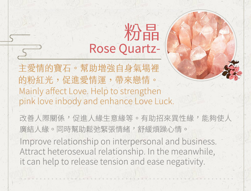 粉水晶能柔化女性,使得更為溫柔有魅力,感情升溫。提升整體自我氣場。