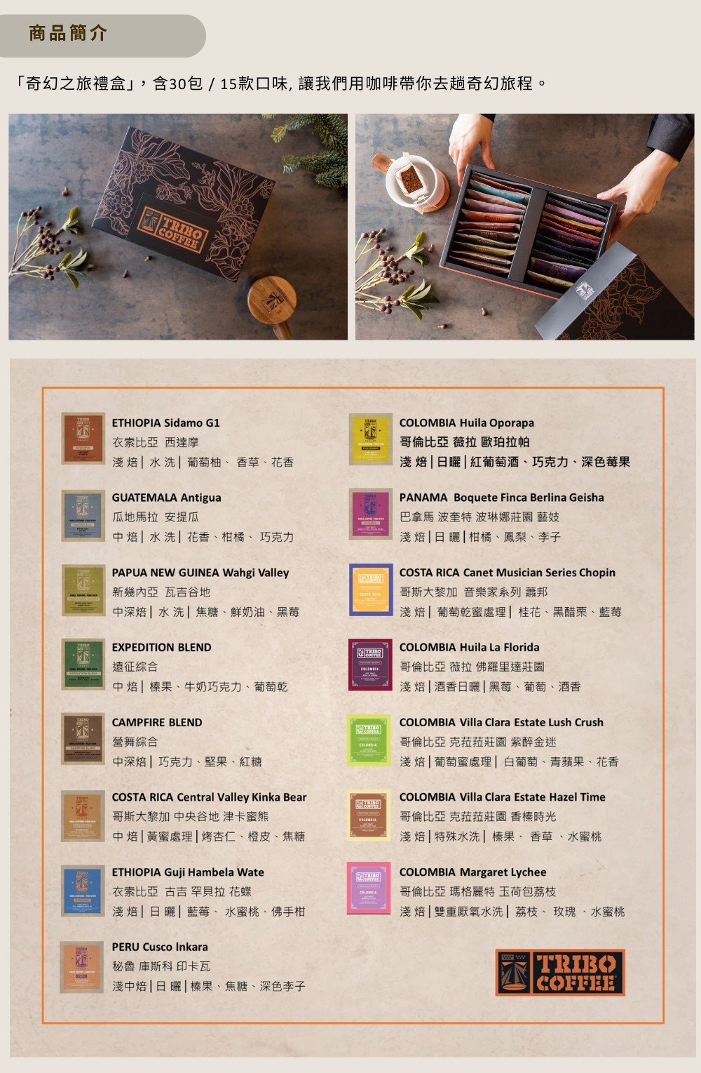 品 名: TRIBO COFFEE 奇幻之旅 濾掛式咖啡禮盒 (30入/15種口味)