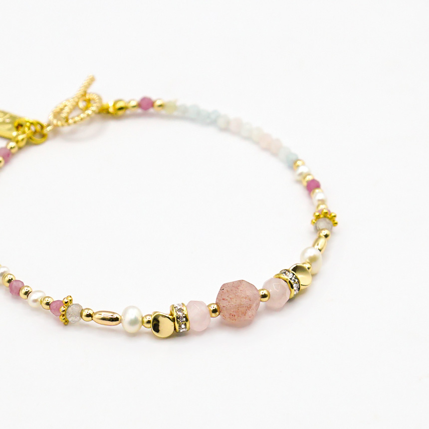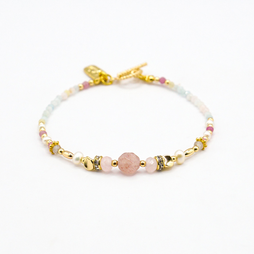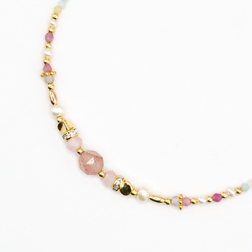 草莓晶、摩根石、拉長石、淡水珍珠、粉晶、粉碧璽、黃銅鍍18K金