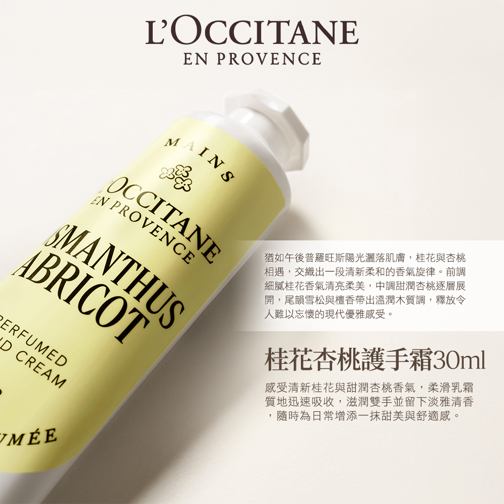 乳霜質地輕盈不黏膩,蘊含乳油木果油、向日葵籽油及桂花萃取,能修護因頻繁清潔消毒而乾燥受損的雙手,滋潤保濕同時也在手部留下桂花優雅香氣。