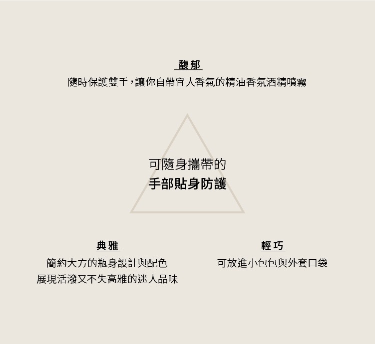 功能 :用餐前、出入公共場所、搭乘大眾交通工具、進出醫院時,可做為手部清潔的輔助品,直接噴灑於手部,無須水洗。