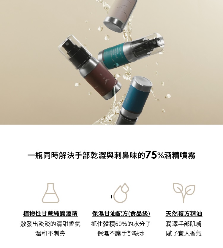 主要成分:WATER 水, 75% Alcohol 植物性酒精, glycerin 植物性甘油, Essential Oil 天然精油。