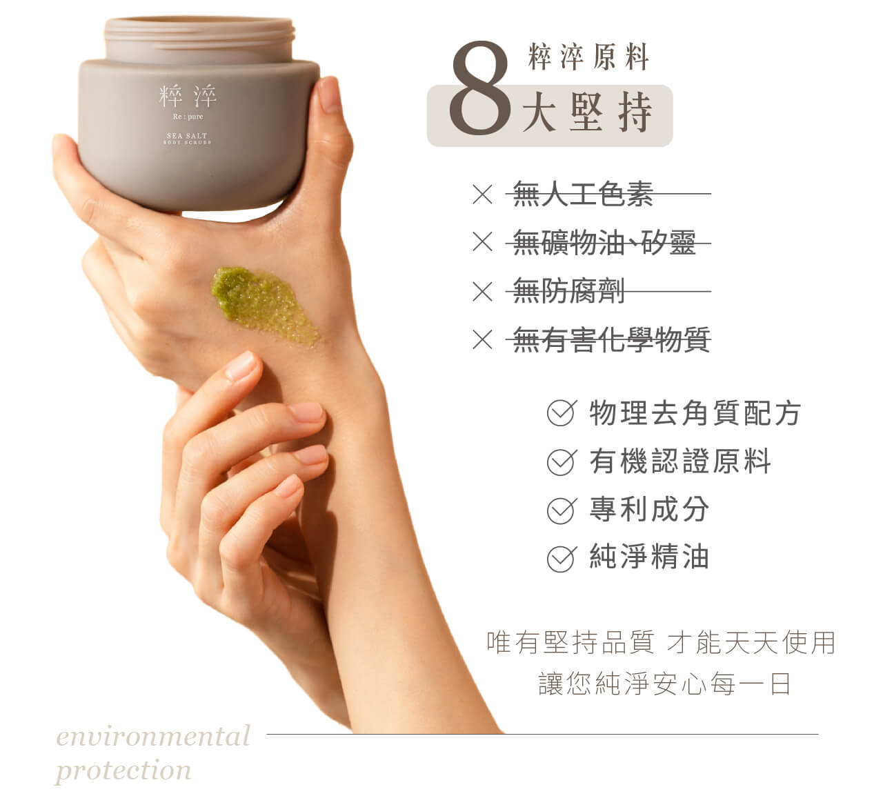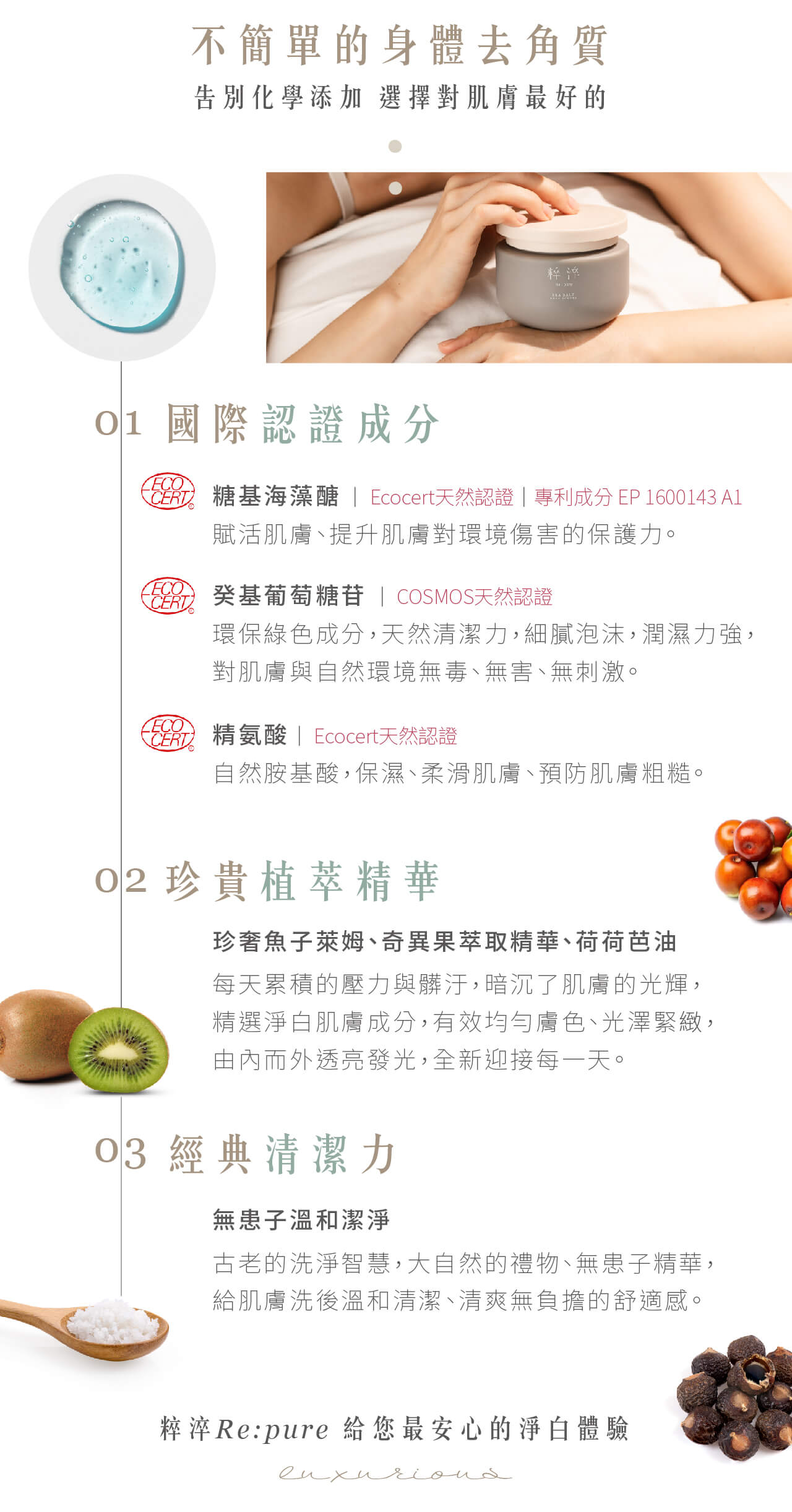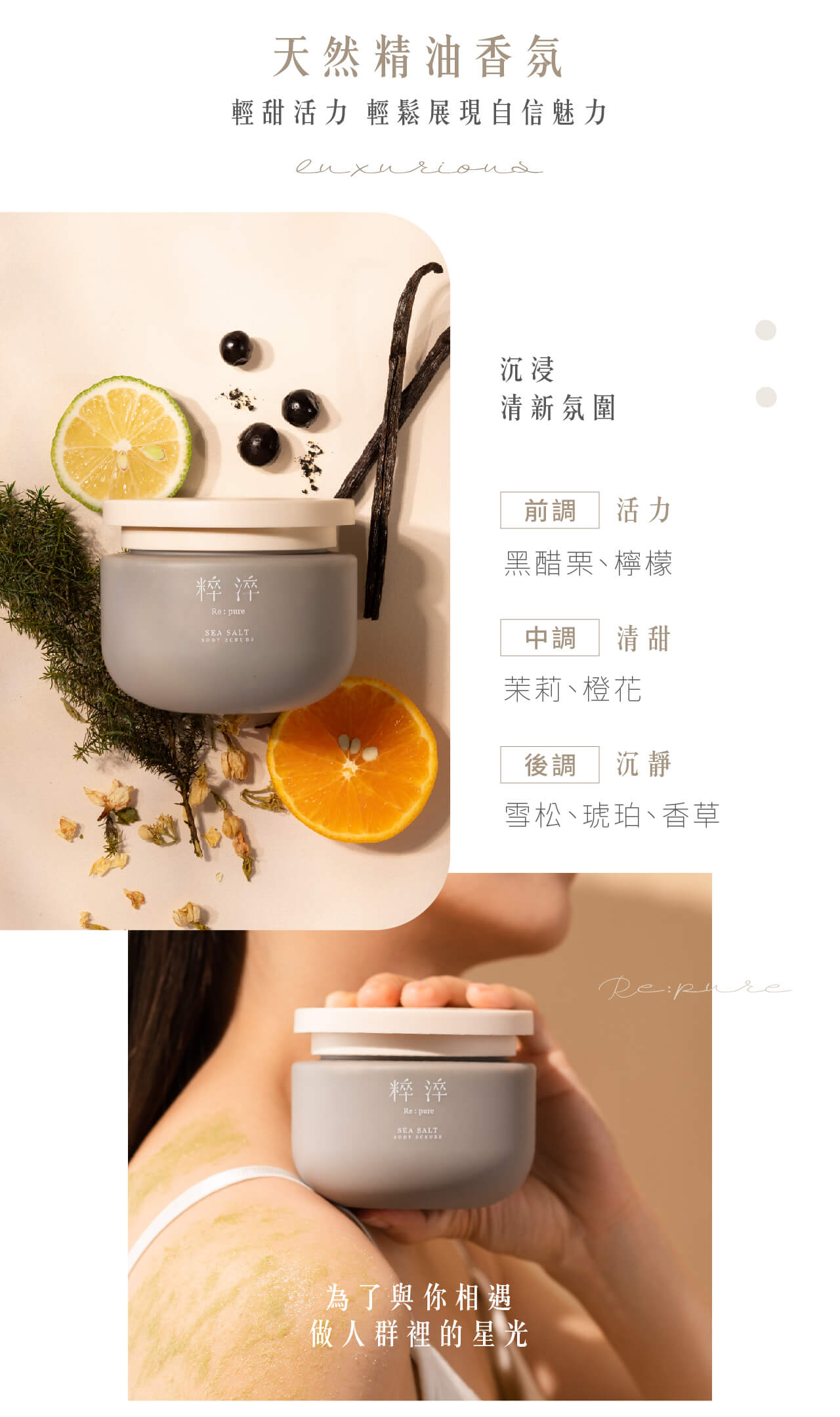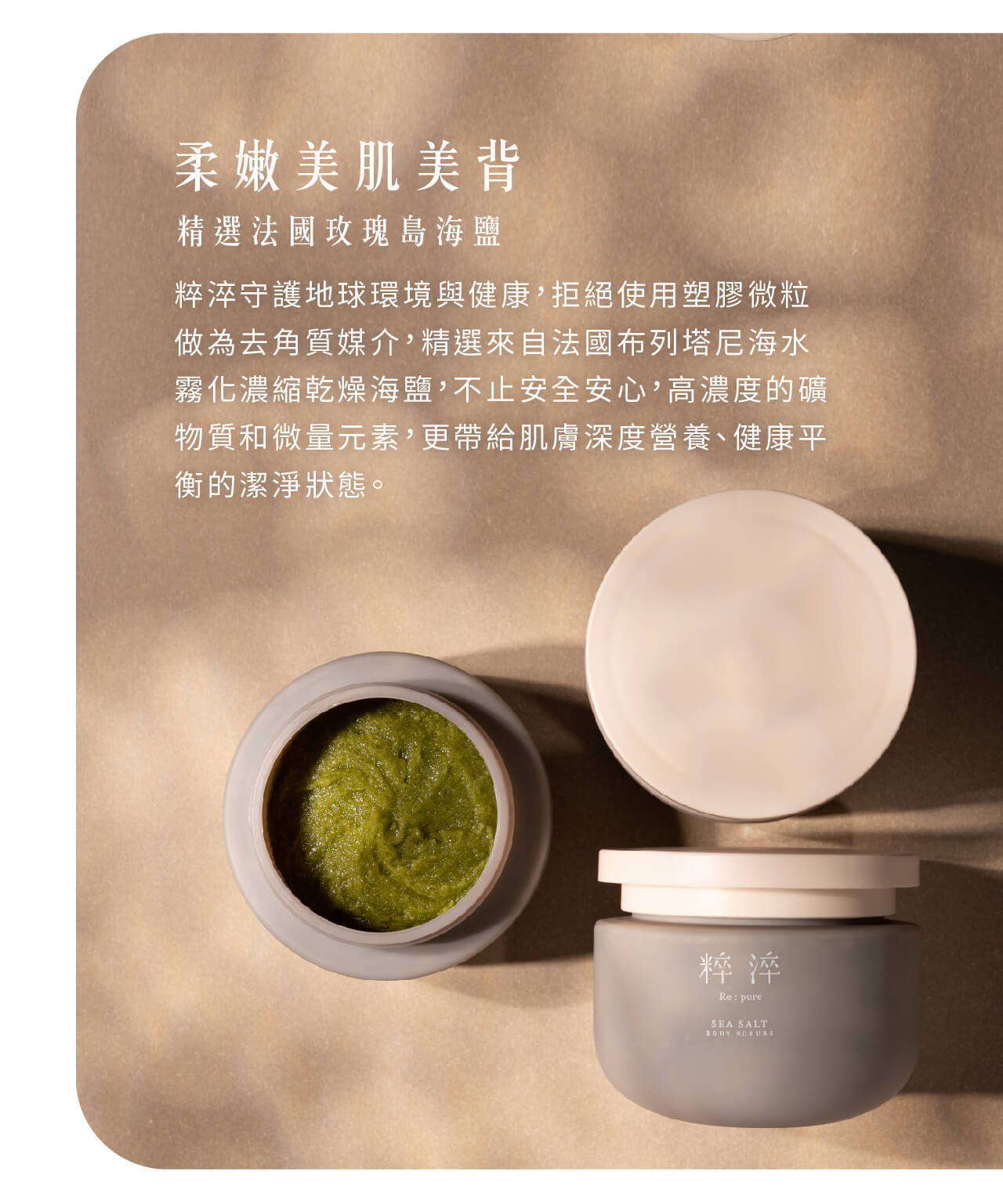 ■蘊含法國玫瑰島海鹽,細緻顆粒不拉扯肌膚。