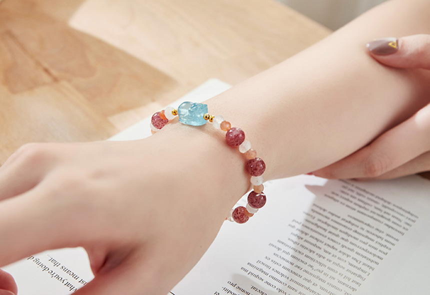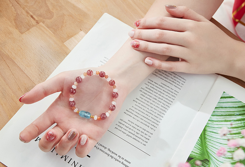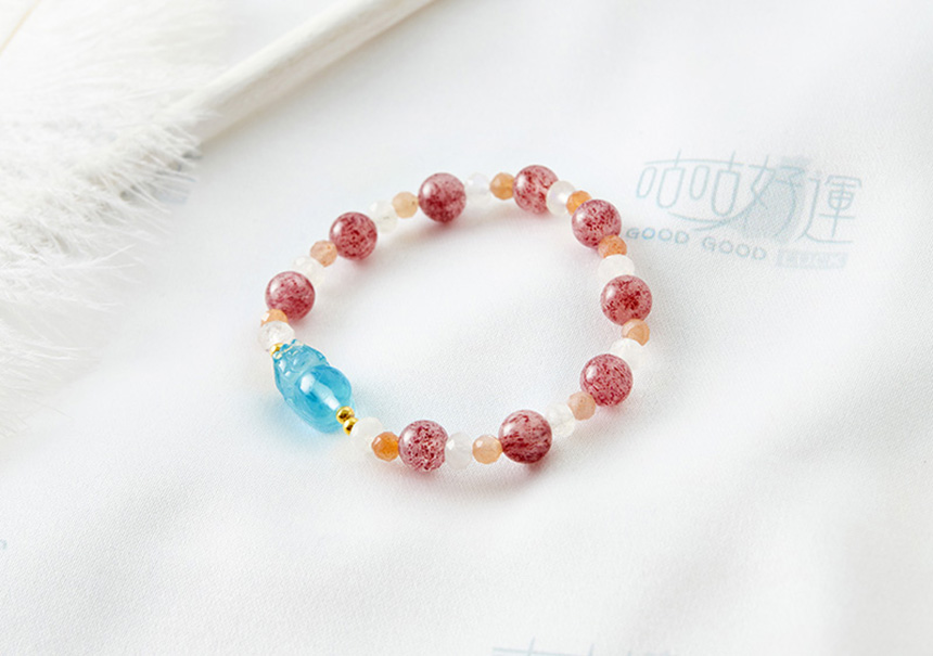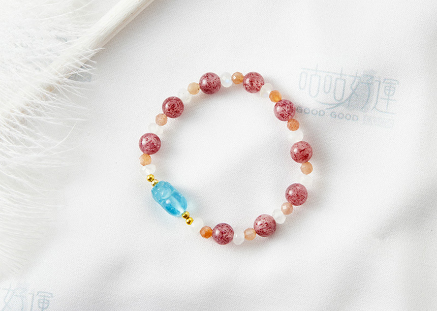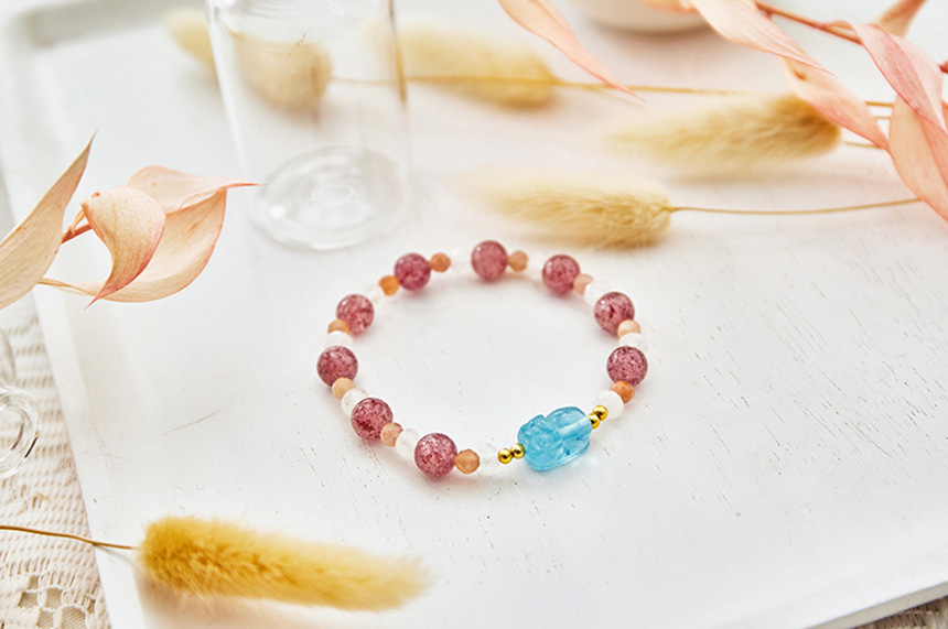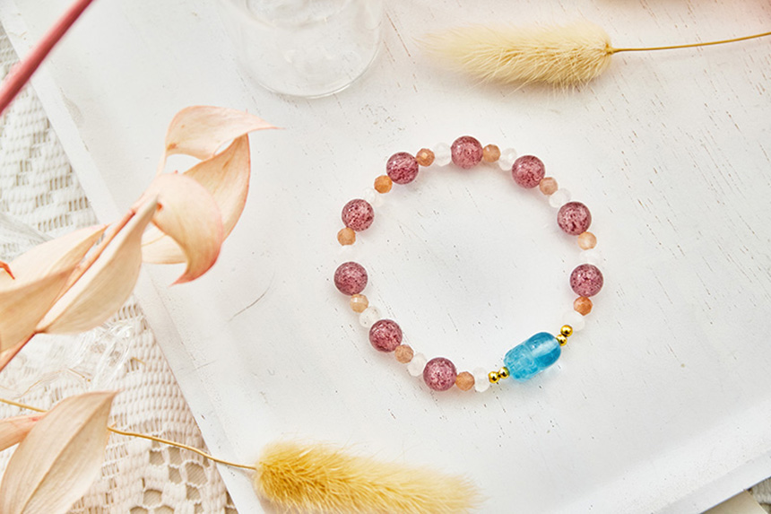 海藍寶幫助提升自信心、招財運、加強判斷力、靈感來源,草莓晶幫助好人緣、人際關係補足、