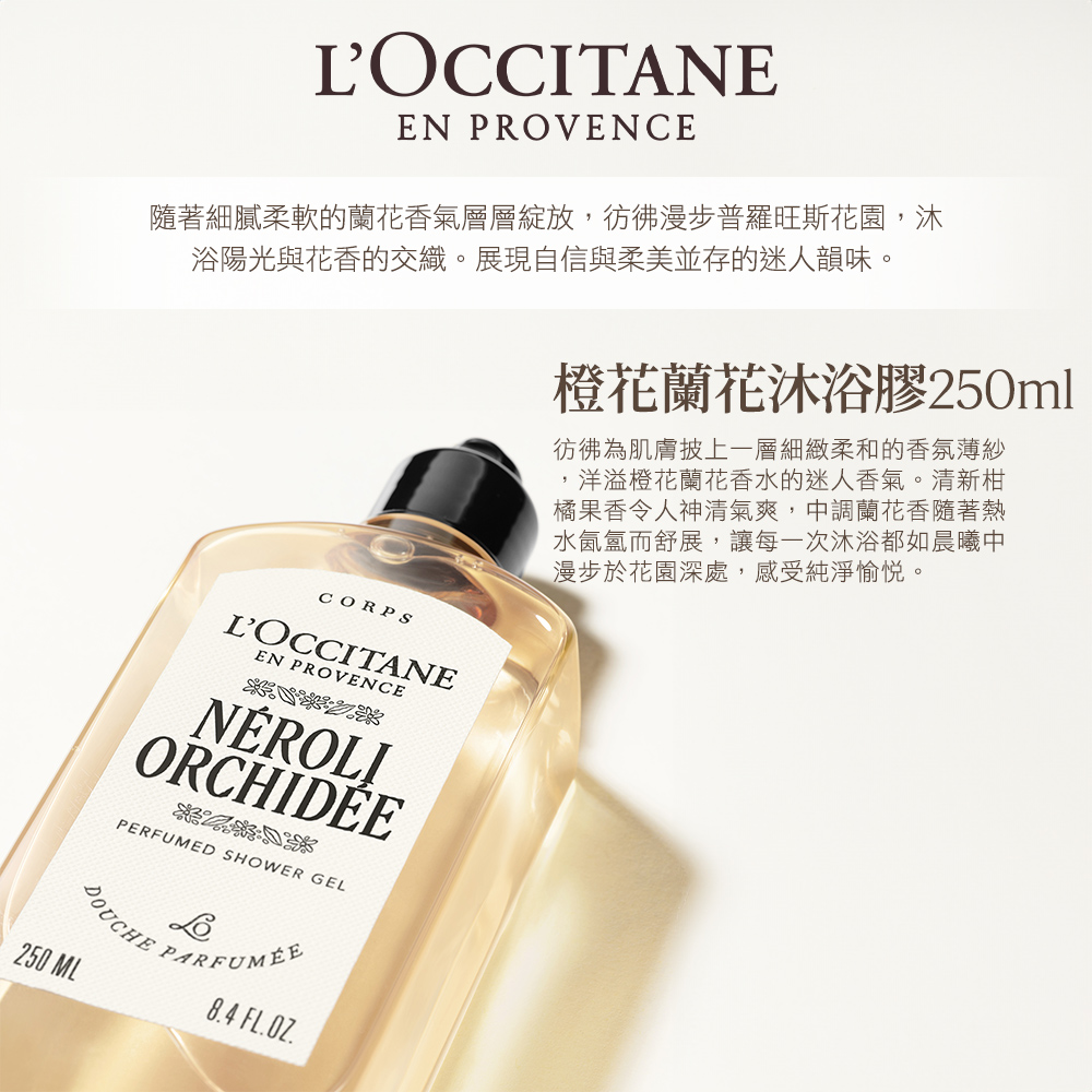 彷彿為肌膚披上一層細緻柔和的香氛薄紗,洋溢橙花蘭花香水的迷人香氣。清新柑橘果香令人神清氣爽,中調蘭花香隨著熱水氤氳而舒展,讓每一次沐浴都如晨曦中漫步於花園深處,感受純淨愉悅。