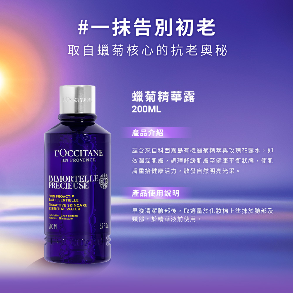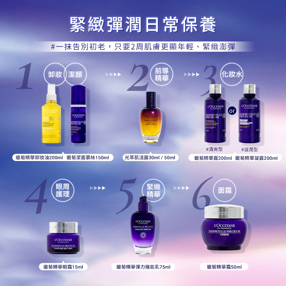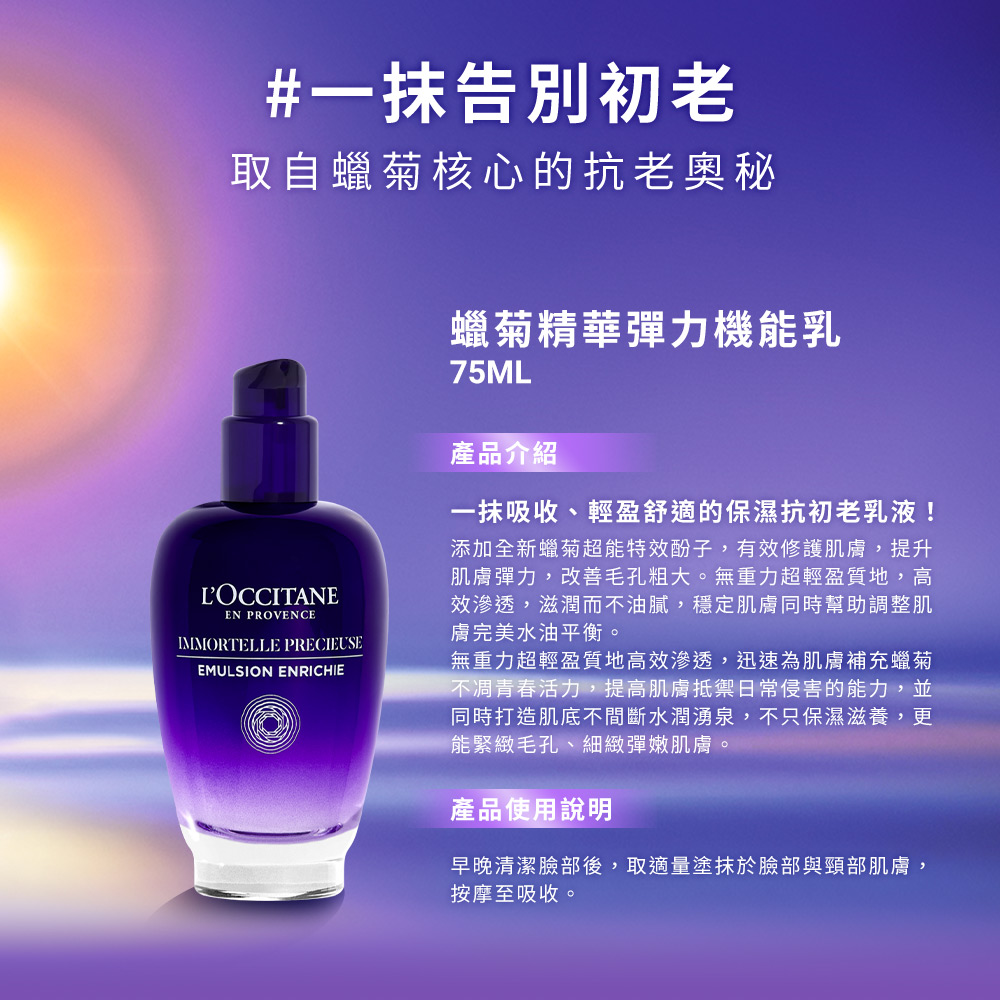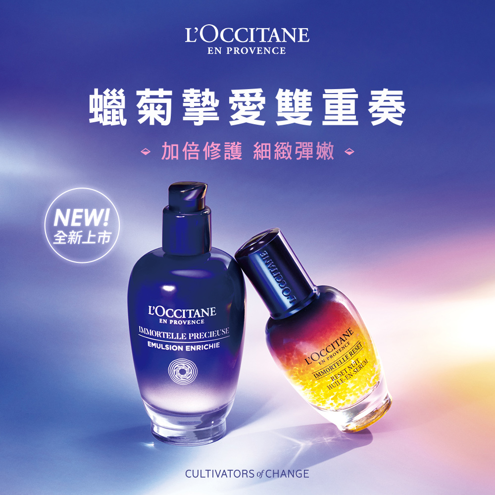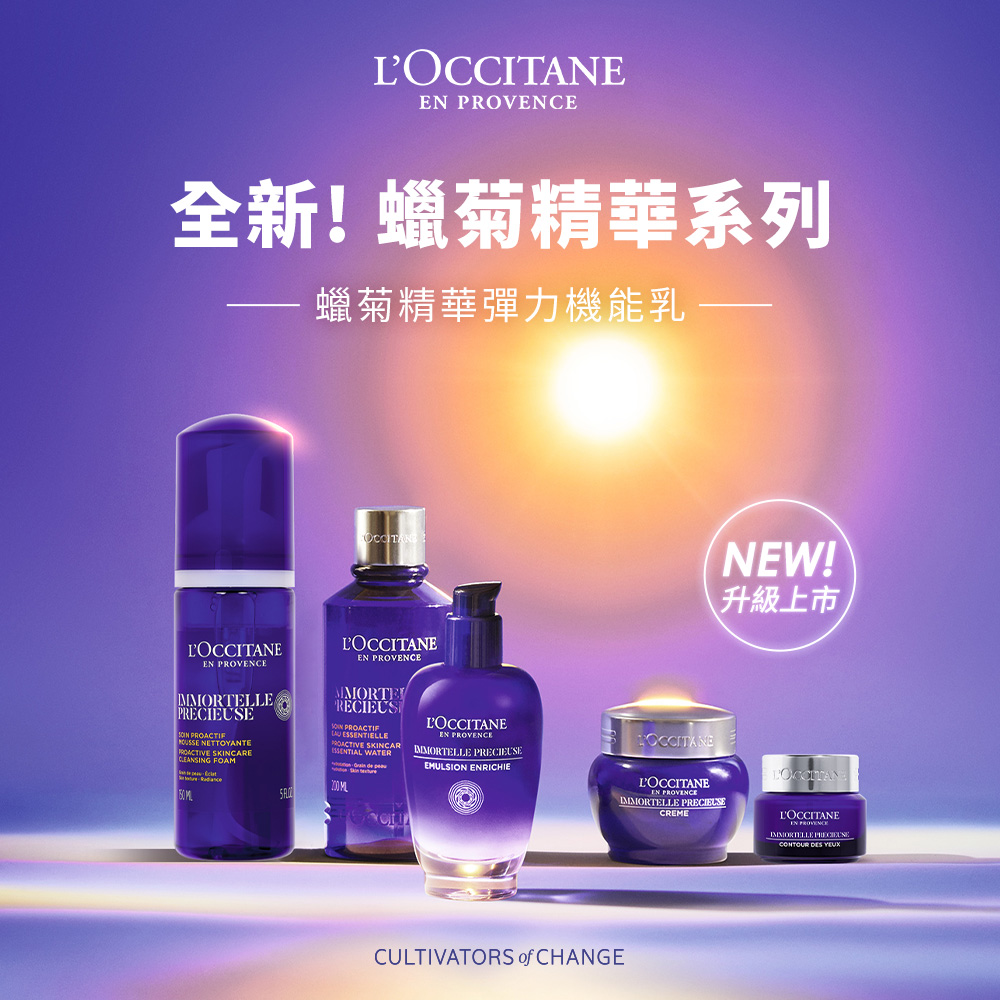 歐舒丹抗皺紋緊緻保養系列,運用具卓越抗老功效的蠟菊精華油,結合獨家成分動力玻尿酸,有效修護煥醒肌膚,撫平皺紋,提升膚質飽滿彈性度,使用後,肌膚自然顯得彈潤水亮,同時改善緊緻不再、膚質粗糙、細紋增生、毛孔粗大等初老現象。