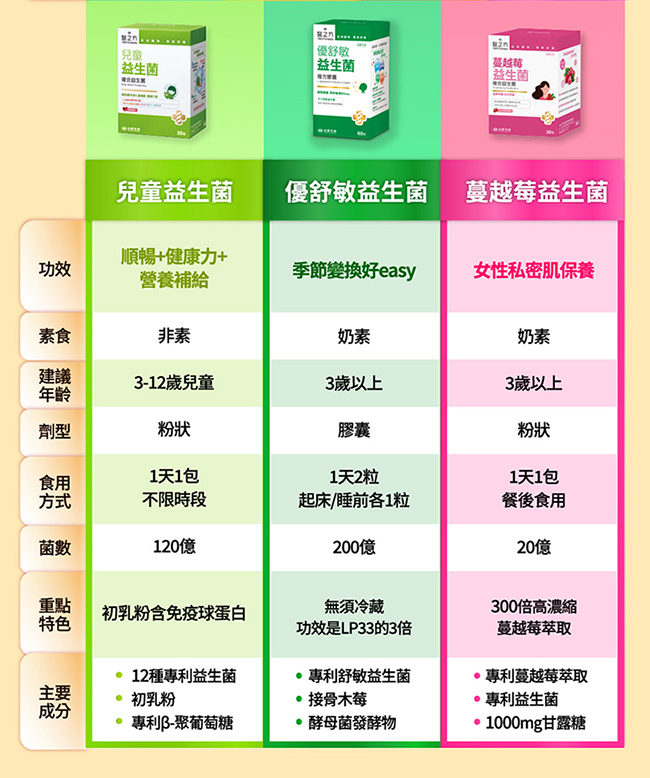 成份:乳酸菌粉(含乳糖、乳糖醇(甜味劑)、Bifidobacterium bifidum、Bifidobacterium . Lactis BS01、Bifidobacterium breve BR03、Bifidobacterium longum、Lactobacillus reuteri、Lactobacillus paracasei、Lactobacillus plantarum LP01、Lactobacillus rhamnosus、Lactobacillus casei、Lactobacillus salivarius、Lactococcus lactis subsp. lactis、Lactobacillus acidophilus、 Lactobacillus fermentum、Lactobacillus johnsonii、Streptococcus thermophiles)、氧化鎂、D-山梨醇(甜味劑)、黑嘉麗果汁粉[砂糖、麥芽糊精、黑嘉麗濃縮汁、蘋果濃縮汁、檸檬酸、檸檬酸鈉、香料(香料、焦糖色素)、食用紅色六號]、檸檬酸、蘋果濃縮汁、阿拉伯膠、脫脂奶粉、複合寡多糖[菊糖(菊苣纖維)、果寡糖、木寡糖、半乳寡糖]、鳳梨萃取物(含鳳梨酵素)、香料、蔓越莓果汁粉(麥芽糊精、蔓越莓濃縮汁、葡萄汁色素、辛烯基丁二酸鈉澱粉、黑加侖濃縮汁、檸檬酸、蔓越莓香料)、花果抽出物(洛神花、接骨木莓、玫瑰果、檸檬皮、香料、麥芽糊精)、維生素C、中鏈脂肪酸甘油酯粉(中鏈脂肪酸、麥芽糊精、麥芽糖漿、酪蛋白鈉、脂肪酸甘油脂、乳酸硬脂酸鈉、磷酸氫二鉀、多磷酸鈉、維生素E)、大豆發酵萃取物、酵素水解小麥蛋白(含麩醯胺酸胜肽)、甜菜根粉、牛蒡萃取物、植物綜合酵素(麥芽糊精、澱粉分解酵素、蛋白分解酵素、脂肪分解酵素、乳糖分解酵素、纖維分解酵素)、柿子抽出物。