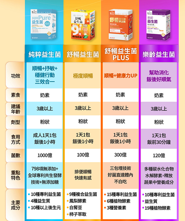 成份:乳糖、蔗糖、葡萄糖、嗜熱鏈球菌(含麥芽糊精、嗜熱鏈球菌Streptococcus thermophilus)、阿拉伯膠、果寡糖、草莓果汁粉[含草莓濃縮汁、麥芽糊精、氧化澱粉(樹薯)、紅甜菜汁、檸檬酸、香料]、蘋果濃縮汁、二氧化矽、紅甜菜粉(含紅甜菜濃縮汁、麥芽糊精)、副乾酪乳酸桿菌(含麥芽糊精、副乾酪乳酸桿菌Lactobacillus paracasei、微結晶狀α-纖維素)、初乳粉[含牛初乳、牛奶蛋白、奶粉、中鏈三酸甘油酯、卵磷脂(葵花)、香料(含麥芽糊精、香料、二氧化矽)]、DL-蘋果酸、香料(含香料、丙二醇、乳糖、二氧化矽、酒精)、檸檬酸、菊糖、乳果寡醣、複合乳酸菌(含微結晶狀α-纖維素、乾酪乳桿菌Lactobacillus casei、植物乳桿菌Lactobacillus plantarum、鼠李糖乳桿菌Lactobacillus rhamnosus、短雙歧桿菌Bifidobacterium breve、動物雙歧桿菌乳雙歧亞種Bifidobacterium animalis subsp. Lactis、長雙歧桿菌Bifidobacterium longum、副乾酪乳桿菌Lactobacillus paracasei、嗜熱鏈球菌Streptococcus thermophilus、嗜酸乳桿菌Lactobacillus acidophilus、羅伊氏乳桿菌Lactobacillus reuteri、兩歧雙歧桿菌Bifidobacterium bifidum)、β-聚葡萄糖、芽孢乳酸菌(含麥芽糊精、芽孢乳酸菌Bacillus coagulans)、動物雙歧桿菌乳雙歧亞種(含動物雙歧桿菌乳雙歧亞種Bifidobacterium animalis subsp. Lactis、麥芽糊精)、蔗糖素(甜味劑)、鼠李糖乳桿菌(含鼠李糖乳桿菌Lactobacillus rhamnosus、麥芽糊精)