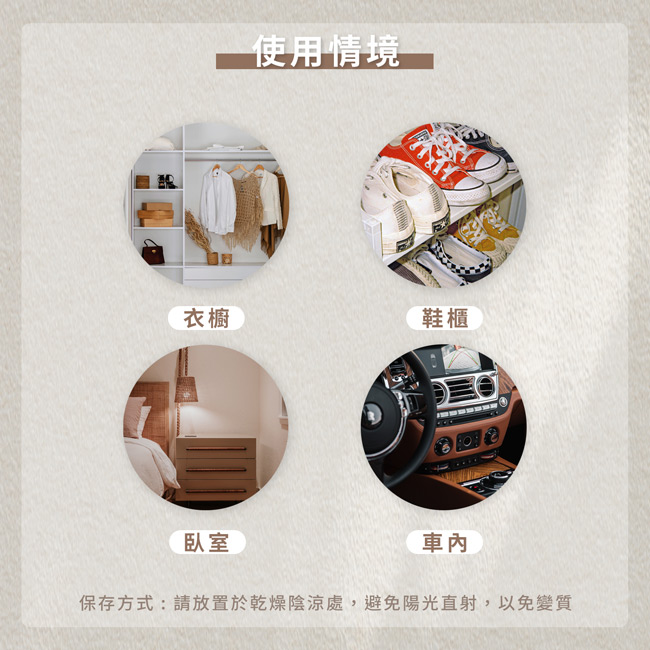 使用方法:直接放置於包包、衣櫃、抽屜內,即可享受芳香。