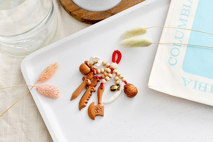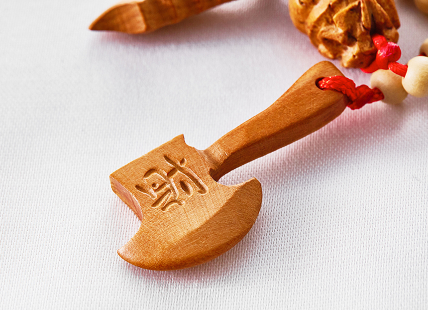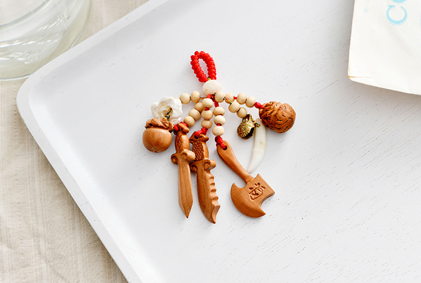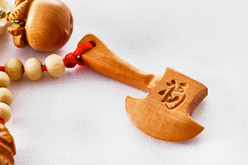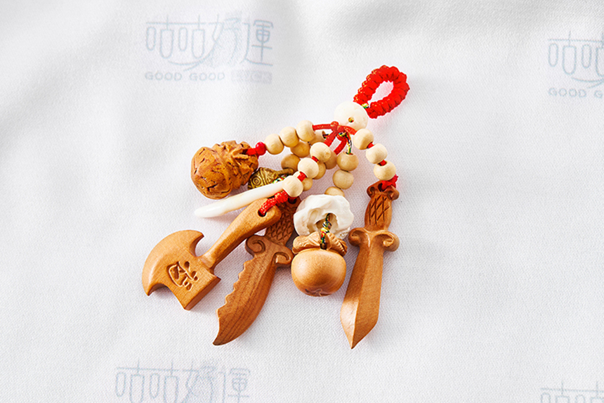 由斧頭、木劍、牙、福袋、鈴組成,經過大師加持開光,能達到保平安、化煞、納福,