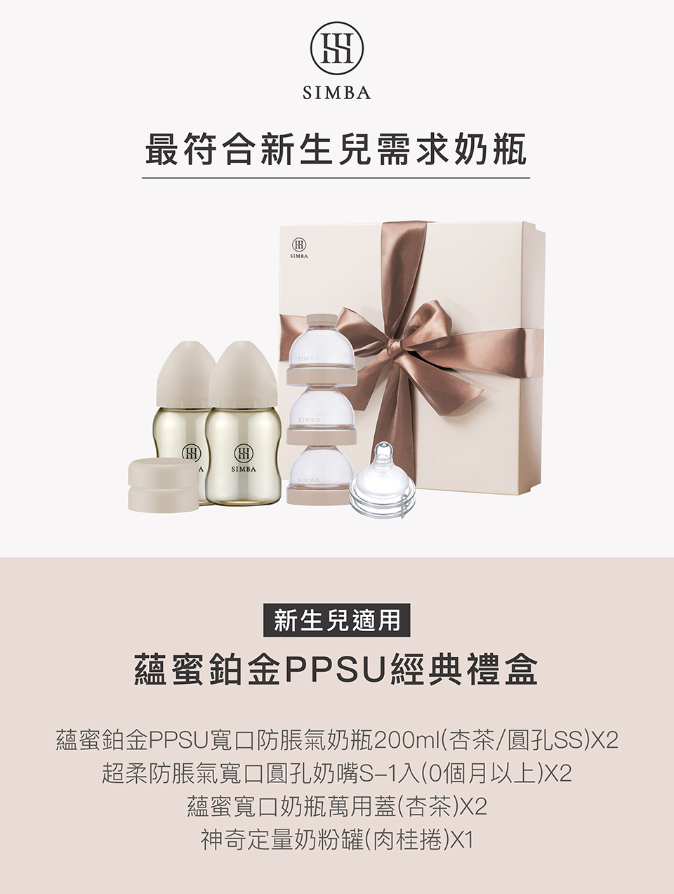 ● 內容物:蘊蜜鉑金PPSU寬口防脹氣奶瓶200ML(杏茶/圓孔SS)X2+超柔防脹氣寬口圓孔奶嘴S-1入(0個月以上)X2+蘊蜜寬口奶瓶萬用蓋(杏茶)X2+神奇定量奶粉罐(肉桂捲)X1