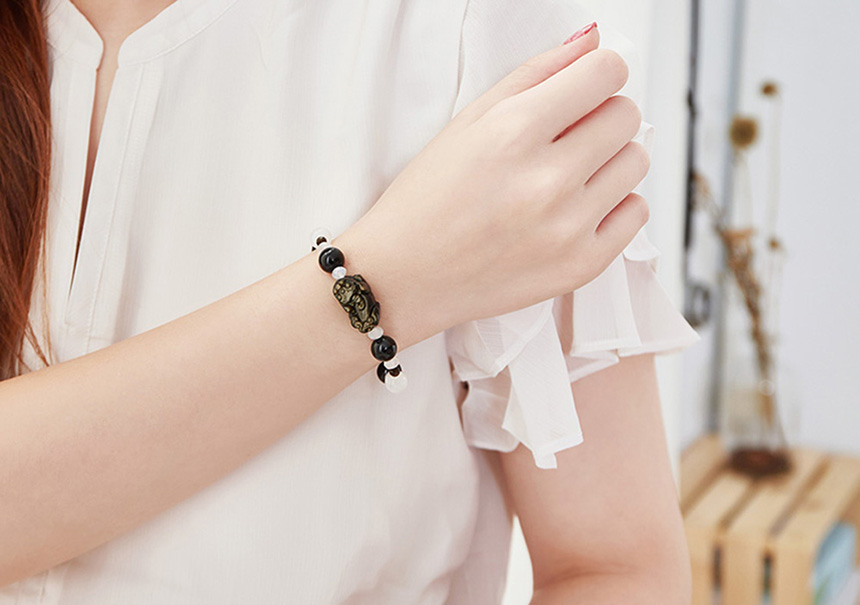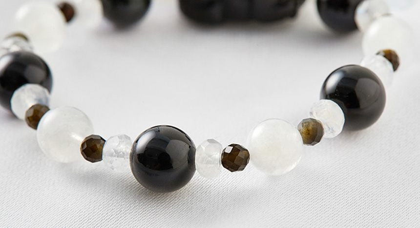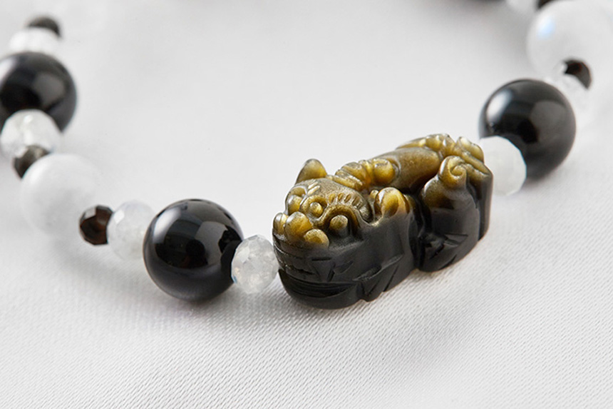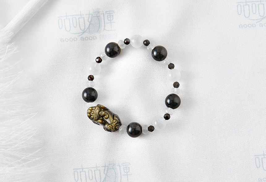貔貅能幫助招財納福,咬財、守庫,達到防小人、化煞、擋災、保平安,月光石能幫助穩定情緒、提升個人魅力。